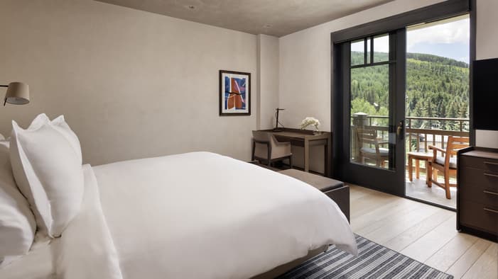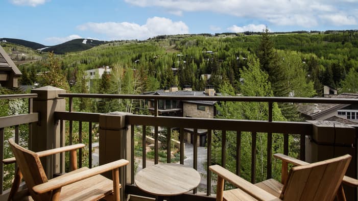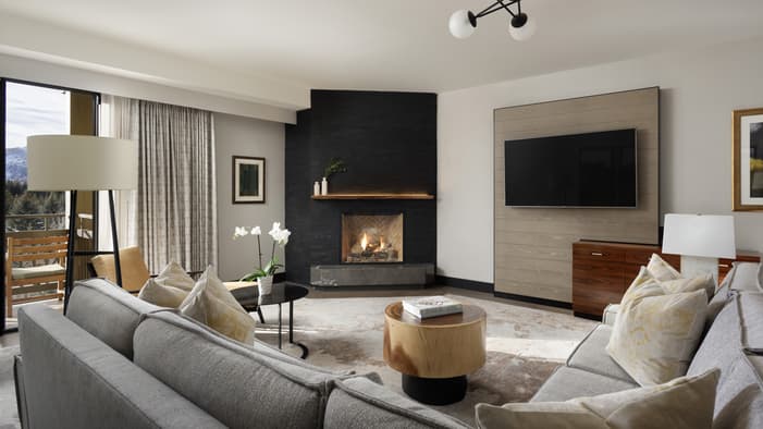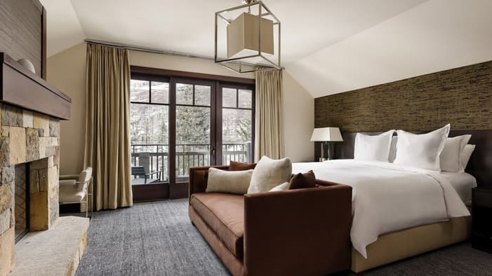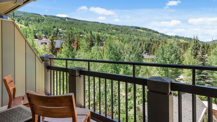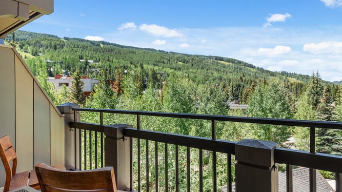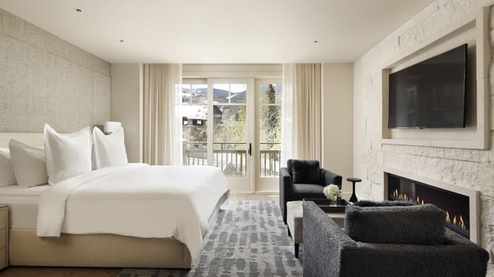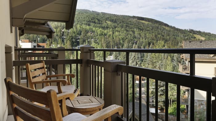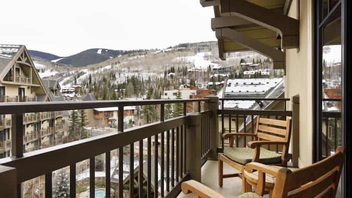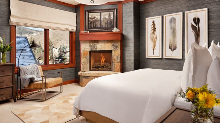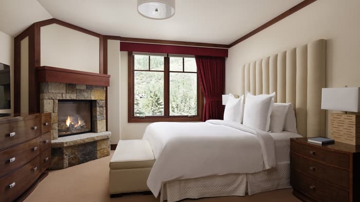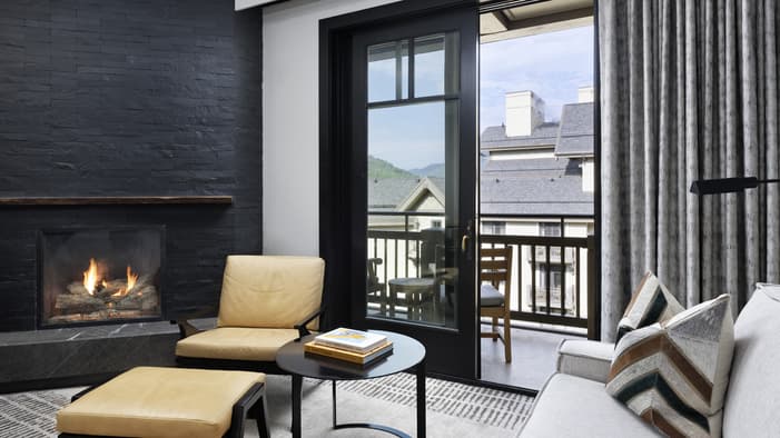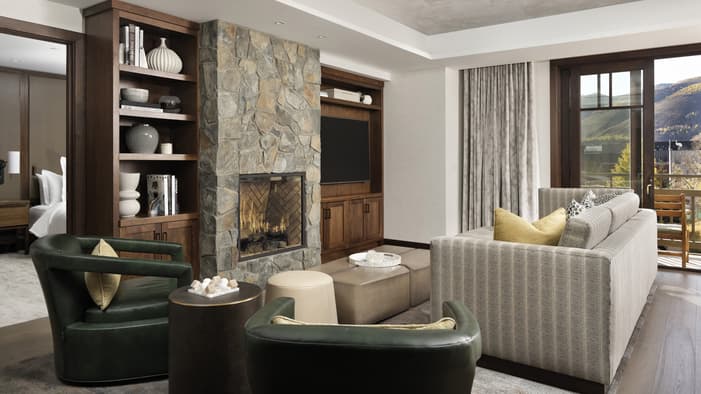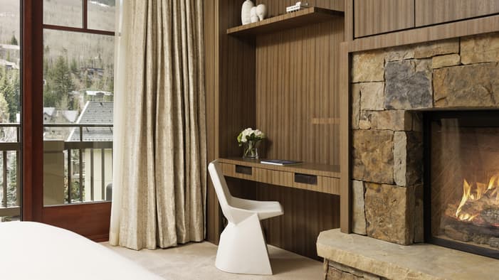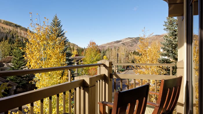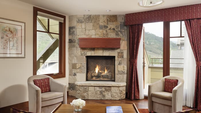 Nuestras habitaciones más grandes en la villa de Vail cuentan con chimenea de gas diseñada en piedra y la mayoría disponen de balcón o terraza totalmente amueblados con vistas a las montañas, la villa o los jardines.