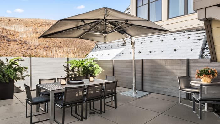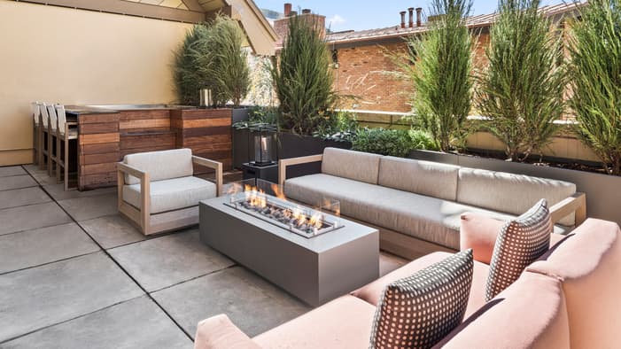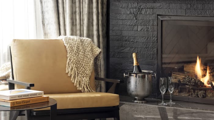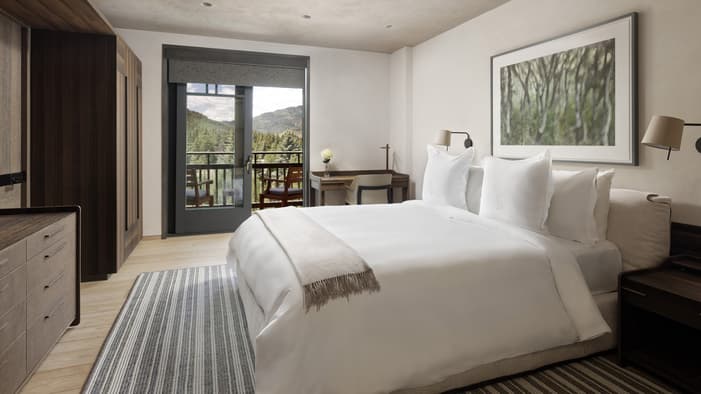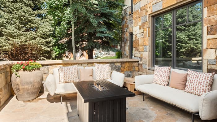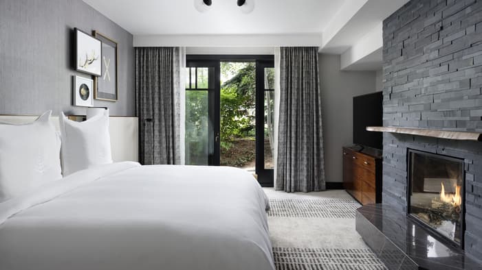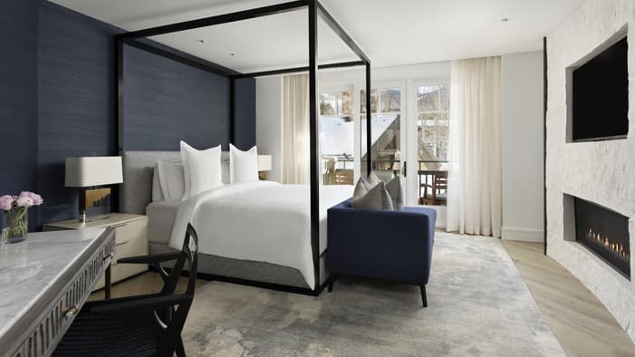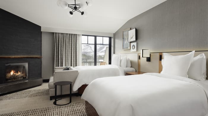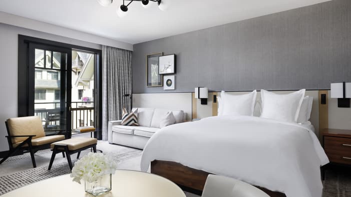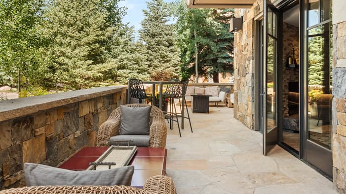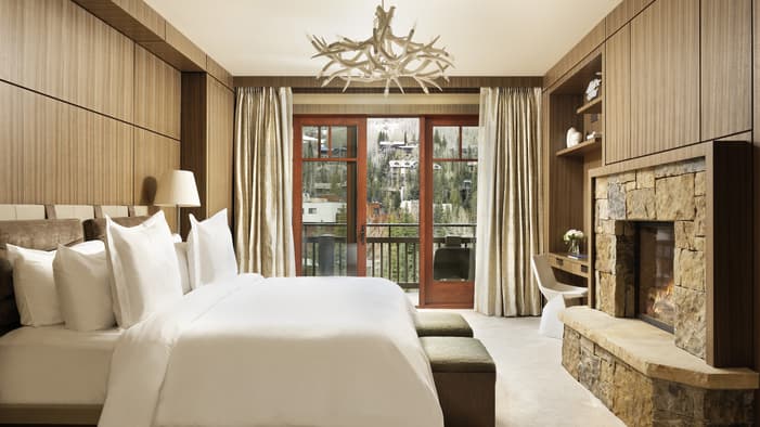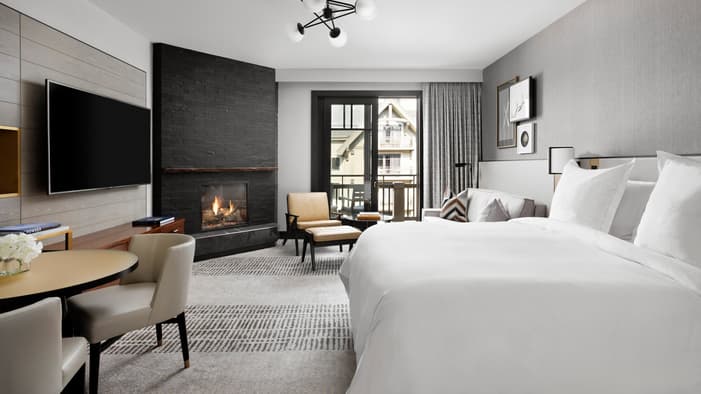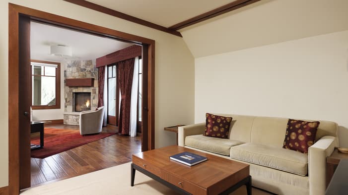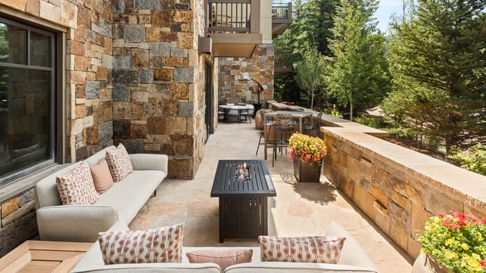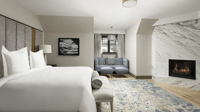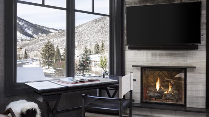 Nuestras habitaciones más grandes en la villa de Vail cuentan con chimenea de gas diseñada en piedra y la mayoría disponen de balcón o terraza totalmente amueblados con vistas a las montañas, la villa o los jardines.