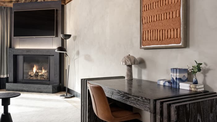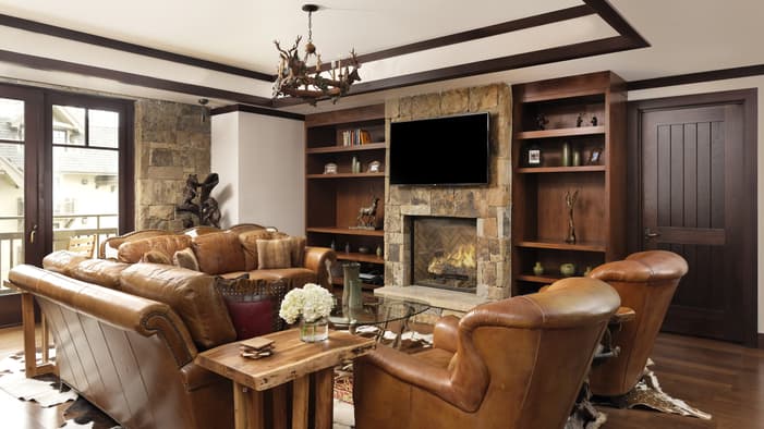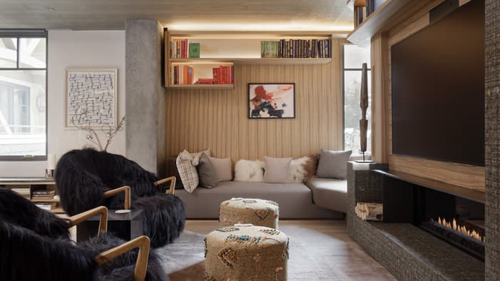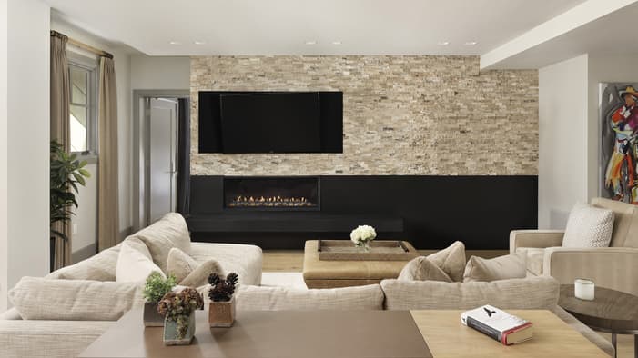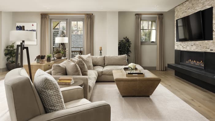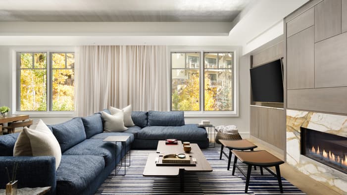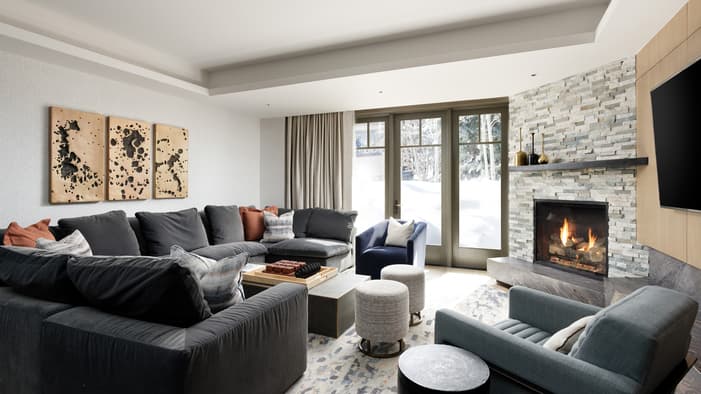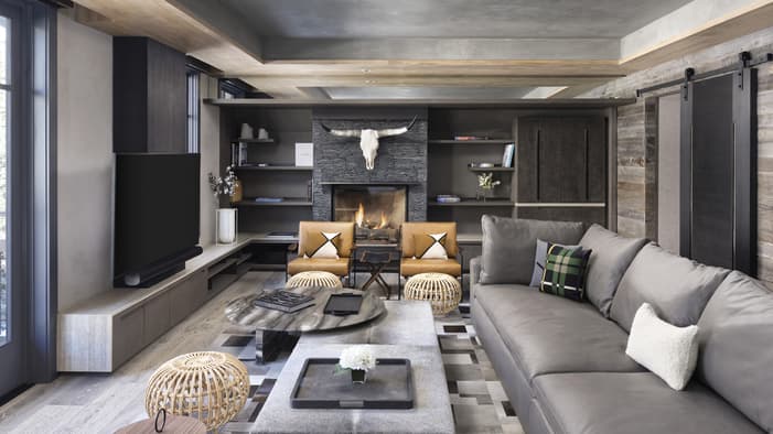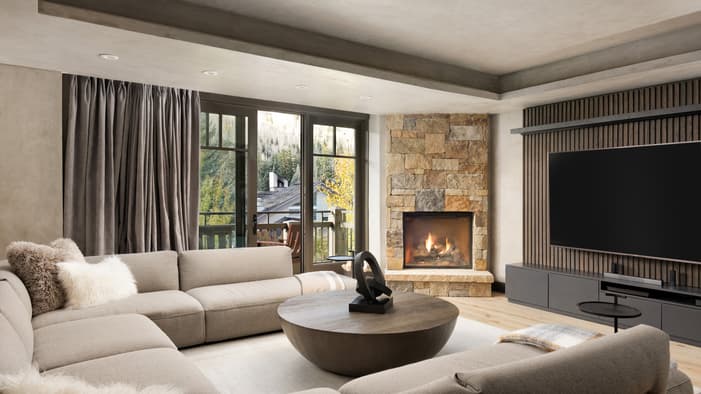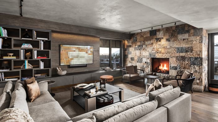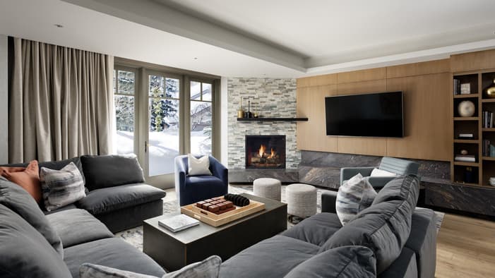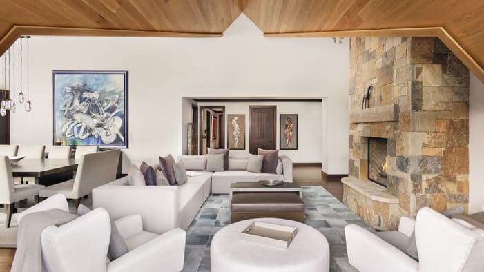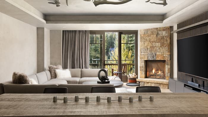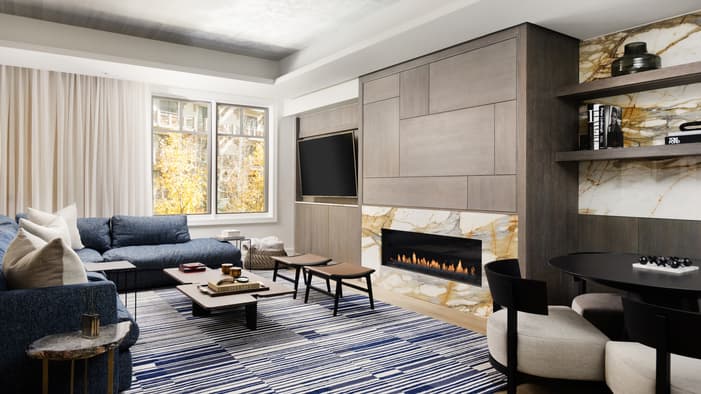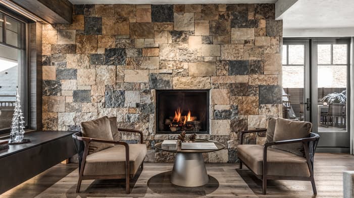 La piedra y la madera locales han aportado toques de estilo elegante de montaña a todas las chimeneas, mientras que las alfombras inspiradas en la naturaleza y las telas texturizadas se han combinado para crear un sofisticado ambiente de resort.
