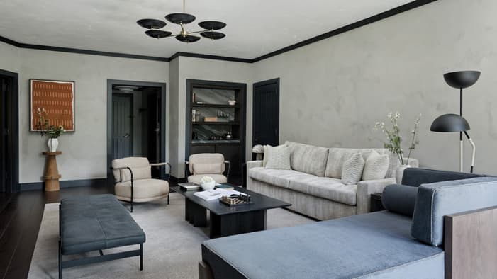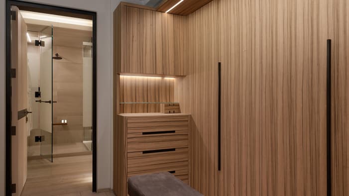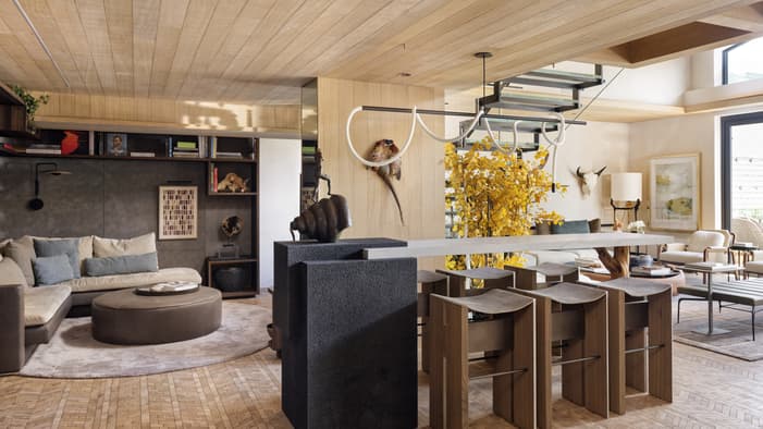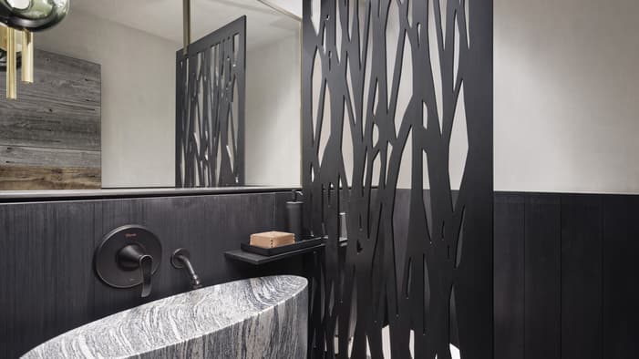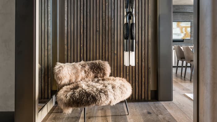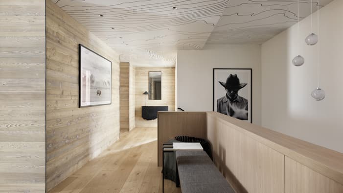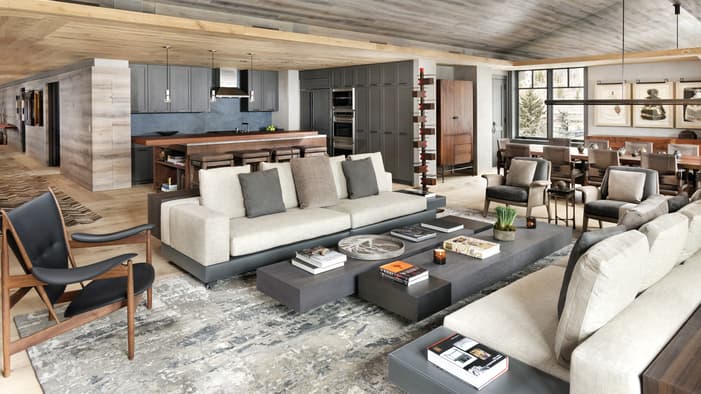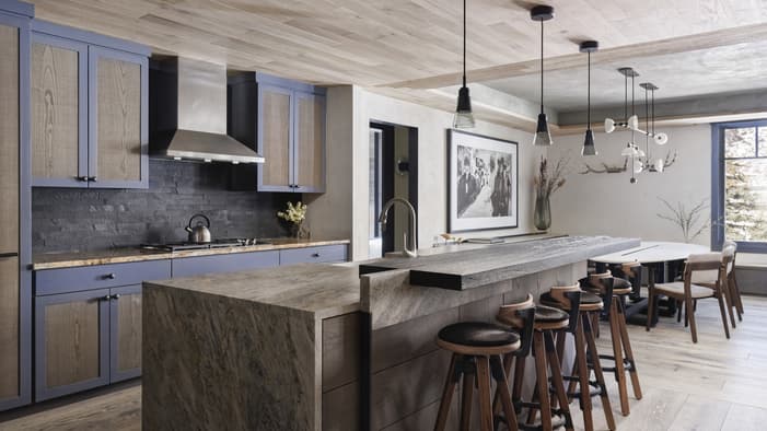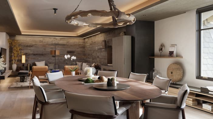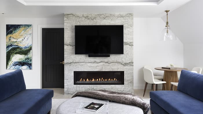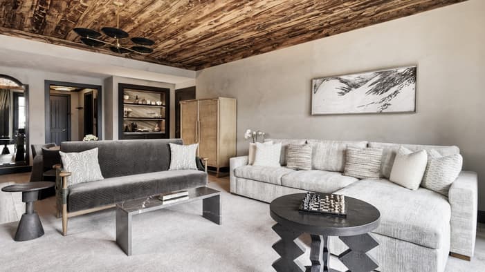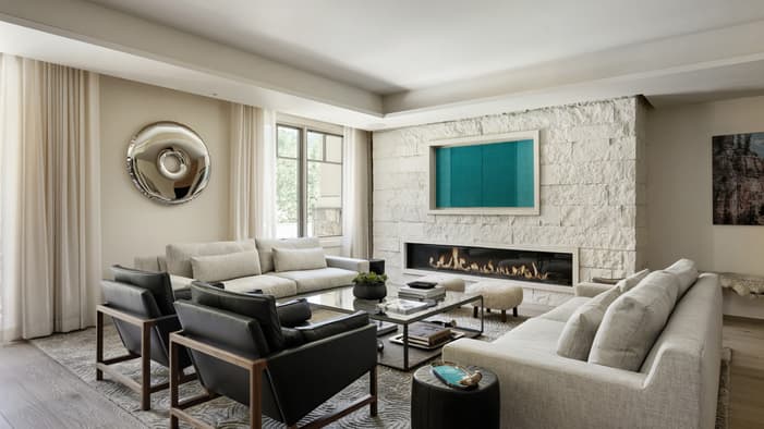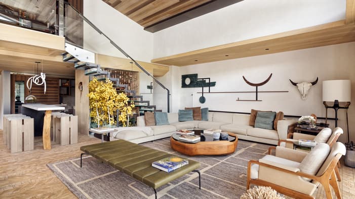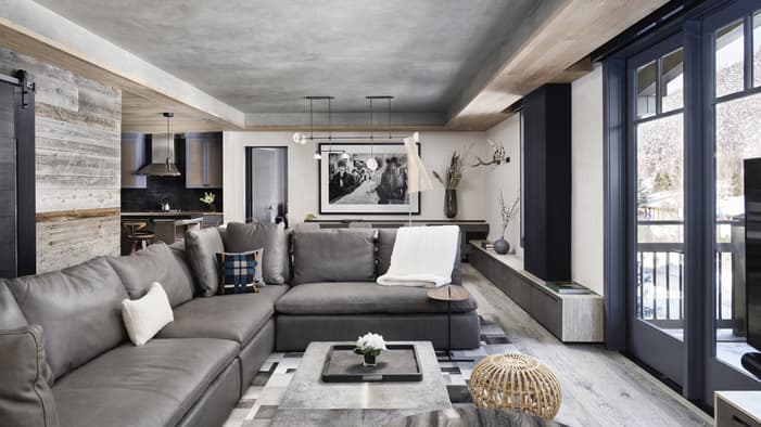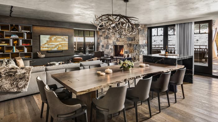 La piedra y la madera locales han aportado toques de estilo elegante de montaña a todas las chimeneas, mientras que las alfombras inspiradas en la naturaleza y las telas texturizadas se han combinado para crear un sofisticado ambiente de resort.
