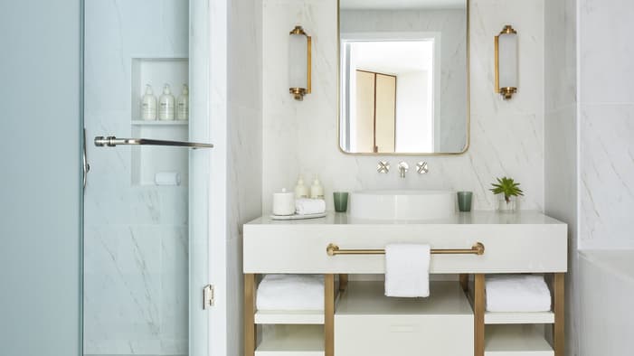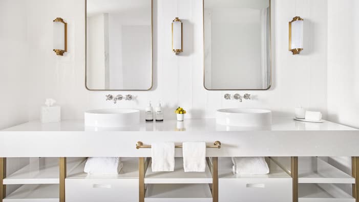 Designed by Tara Bernerd & Partners, our Four Seasons interiors take inspiration from the natural beauty and quality of light in Fort Lauderdale – reflected in pale silver sands, blue seas and stunning Floridan sunsets. This visual influence intermingles with the city’s yachting heritage, encapsulating the freshness and elegance of mid-century modernist design. The sleek lines of yachts inspired the gently curved rattan headboards and the polished walnut-coloured wood shelf that wraps its way around the room. Walls papered with natural pale linen are adorned with playful artwork. This is a design that celebrates the relaxed vacation lifestyle of Fort Lauderdale.