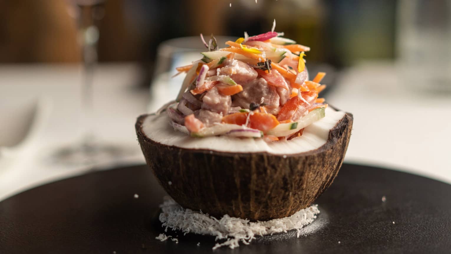 Une œuvre d’art, un mets exquis et un bon moment entre amis. Réunissez vos proches autour de notre poisson cru, un Masterdish élaboré à partir des produits de la mer et de la terre les plus frais, à la carte du Bar et grill de la plage Fare Hoa. Le poisson cru, spécialité la plus célèbre de Polynésie française, s’apprécie à tout moment de la journée.1 / 3