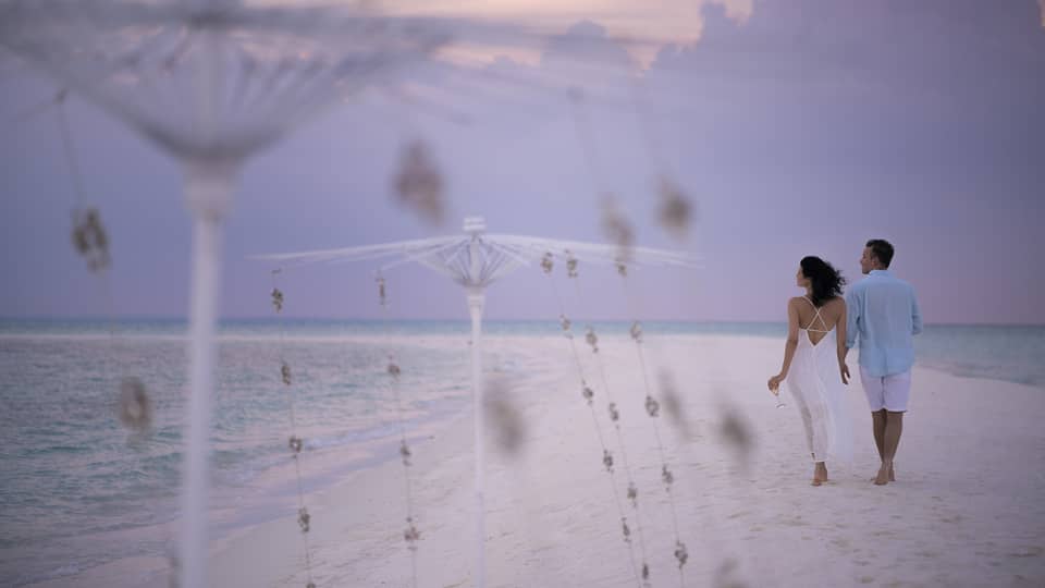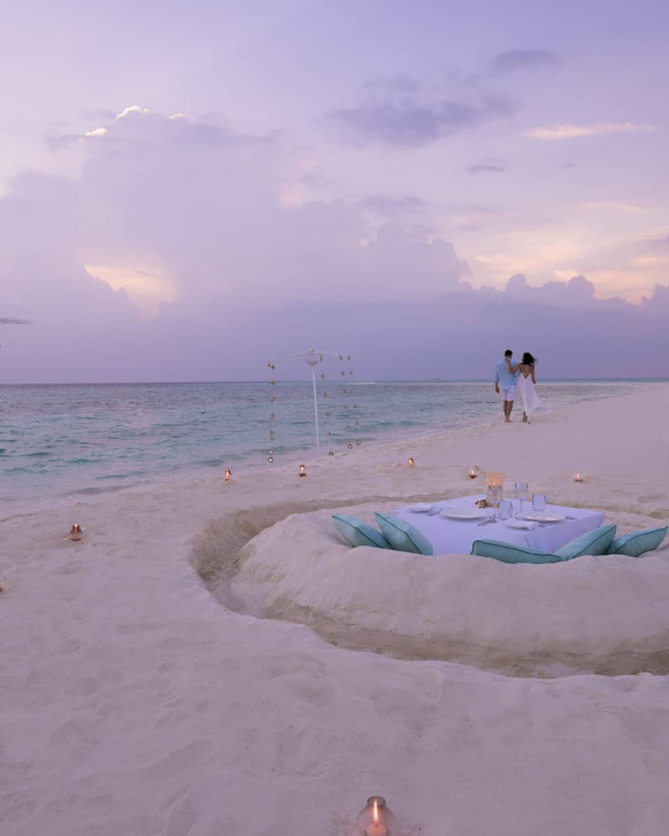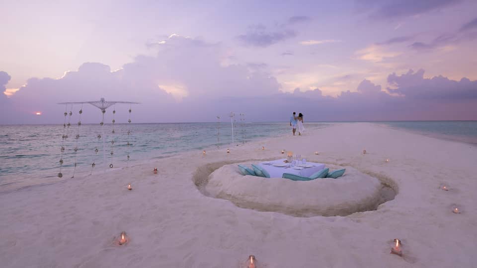Dans la lumière du soleil couchant, un hors-bord vous emmène jusqu'à un banc de sable perdu au milieu du lagon pour une expérience gastronomique époustouflante. Sous des myriades d'étoiles, prenez place à votre table façonnée dans le sable et éclairée de bougies et savourez les délicieux mets préparés au barbecue par vos chefs privés.1 / 5