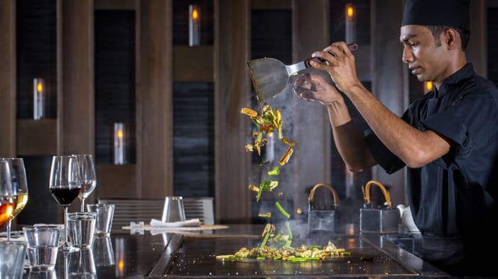 Mettez le cap sur notre impressionnant buffet composé d’huîtres déposées sur de la glace, de coquilles saint-jacques flambées, de homards des Maldives ainsi que d’une sélection de savoureuses espèces locales, fournies pour la plupart par des pêcheurs des Maldives pratiquant une pêche à la ligne responsable et préparées sous vos yeux de différentes manières. Savourez des sushis et des sashimis, mais également des plats cuits au teppanyaki, du risotto au homard, une variété de woks et des Bánh cuốn, ainsi qu’un vaste assortiment de salades et de desserts.