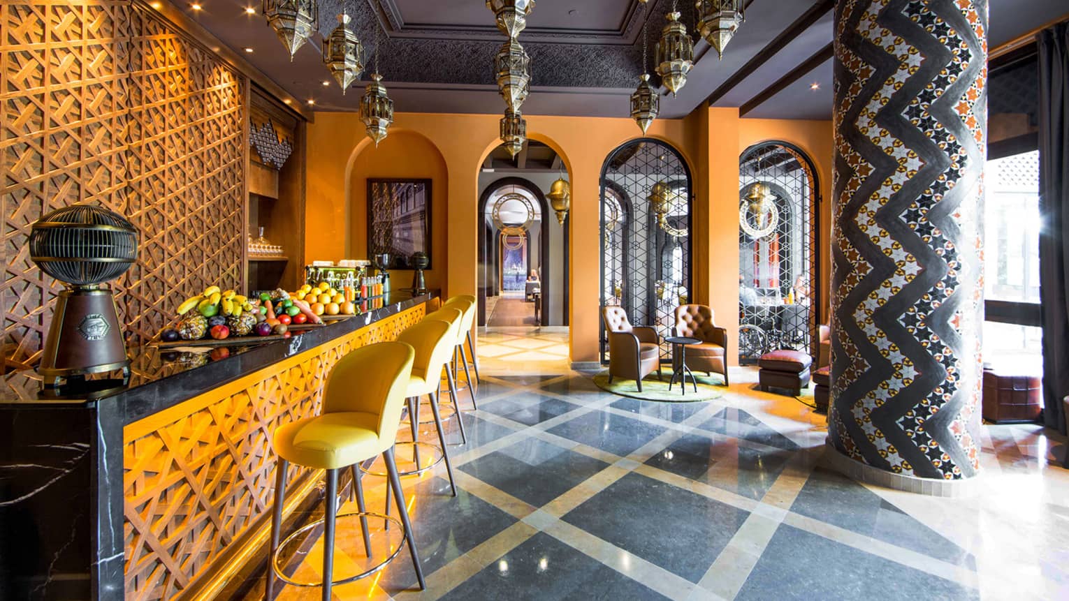Le Zest Rooftop Bar propose une expérience à 360° au cœur des jardins luxuriants du resort, offrant des vues sur les montagnes de l'Atlas et le panorama verdoyant de Marrakech. Un espace convivial est parfait pour se détendre et profiter d'un moment agréable à partir du coucher de soleil, avec des cocktails créatifs et des plats savoureux et éclectiques qui mettent en avant des ingrédients de qualité et des saveurs originales, que vous soyez aux tables hautes ou confortablement installé dans les salons lounges.