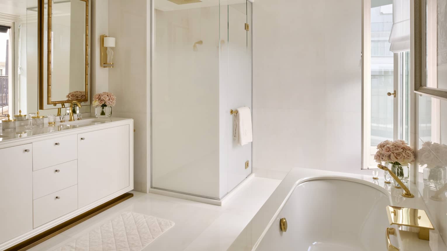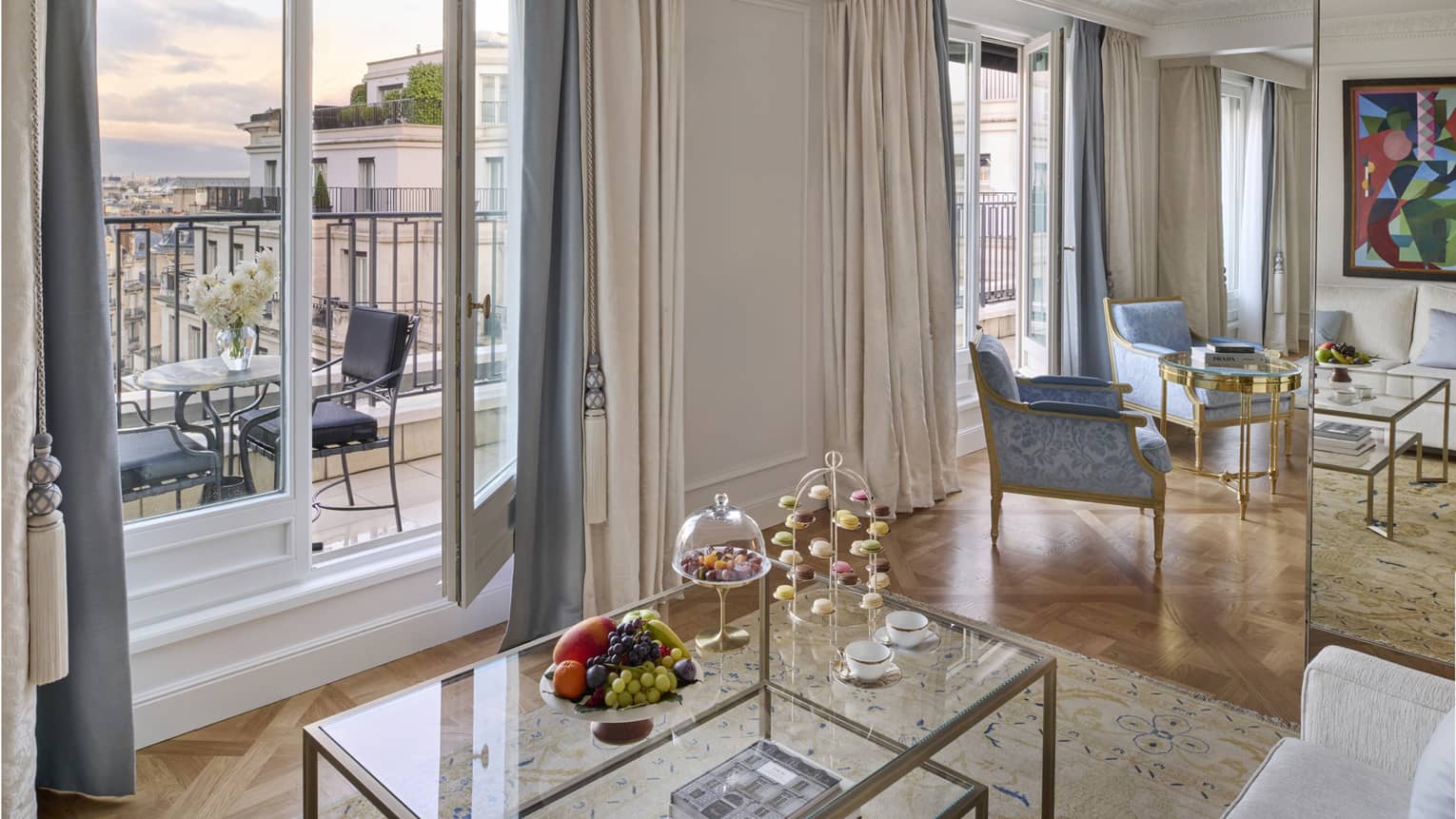 Ces suites au décor raffiné recréent le charme d’un grand appartement parisien, dans un cadre alliant glamour à la française et luxe contemporain. Des œuvres d’art de style classique ou Empire ornent l’intérieur tandis que leur balcon intimiste offre une vue magnifique sur la cour en marbre de l’hôtel.