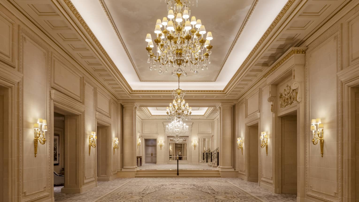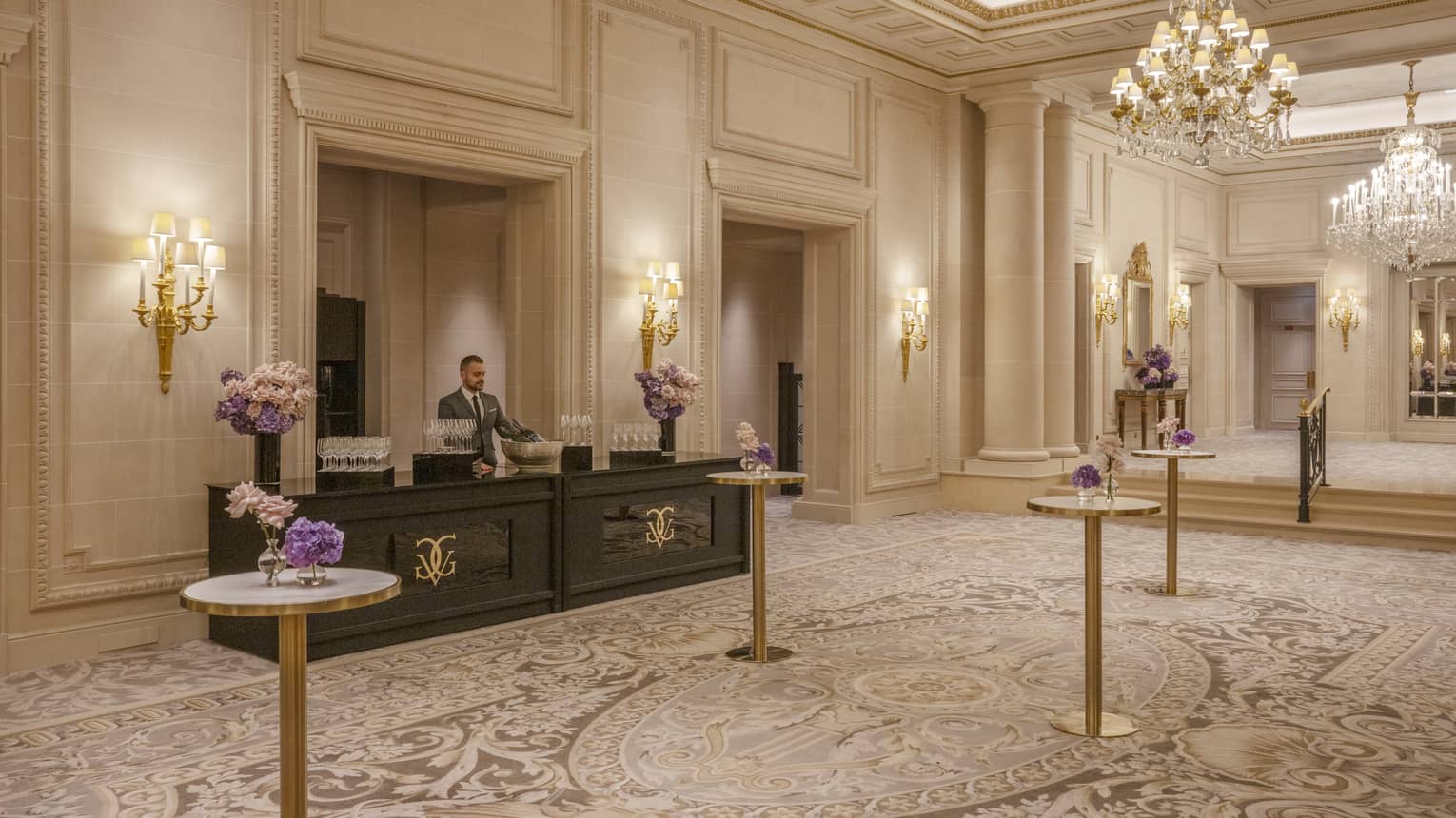 Empruntez le magnifique escalier d'honneur en marbre blond pour pénétrer dans le foyer Vendôme. Saluez chaleureusement vos invités dans cet élégant espace de réception, avant de poursuivre les festivités dans la salle de bal juste à côté.