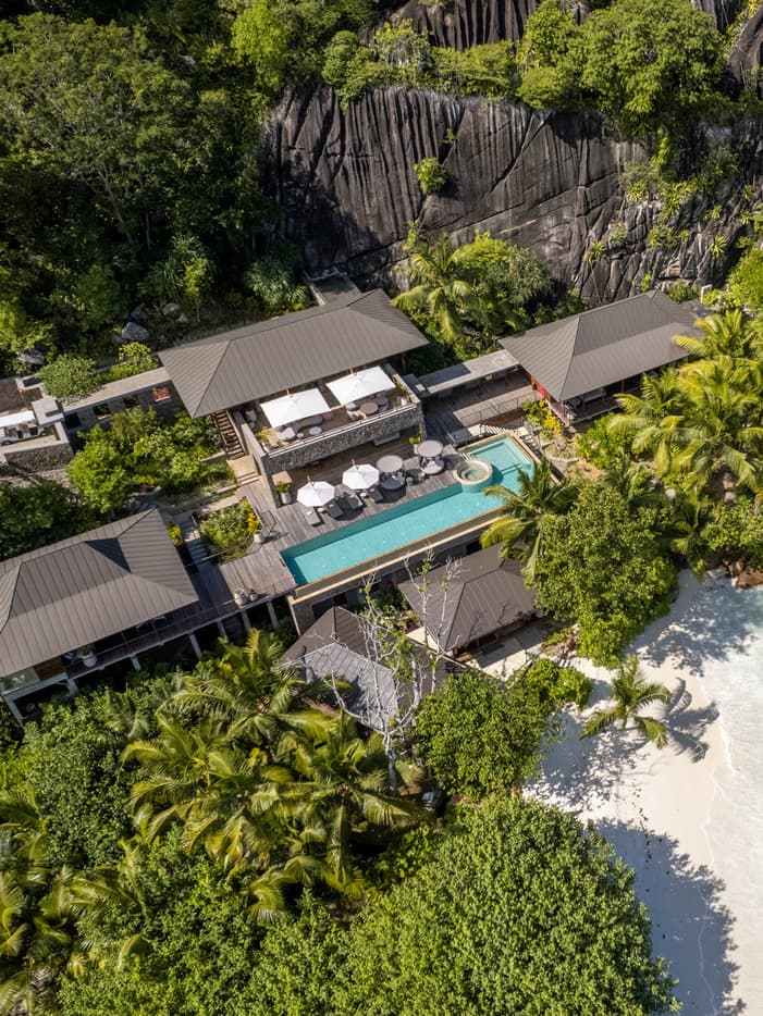 La suite royale à trois chambres est l’une de nos deux suites jouissant d’un accès direct privé à la plage. Elle comprend trois pavillons avec des espaces repas et détente. Elle possède également une salle de sport privée, un bureau avec salon indépendant, une piscine à débordement et une baignoire à jets donnant sur la plage de Petite Anse.