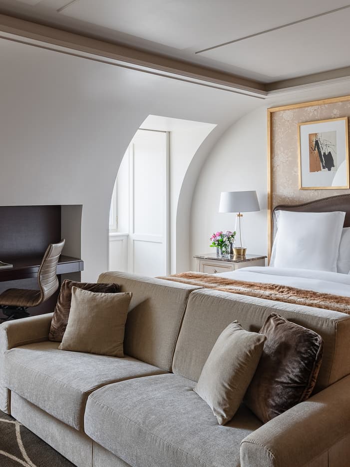 Perfect for road warriors, this contemporary home away from home pairs an ergonomic workspace with the views of Geneva. A superbly appointed marble bathroom pampers with a large vanity, a European soaking tub, an oversized rain shower and a private hammam.