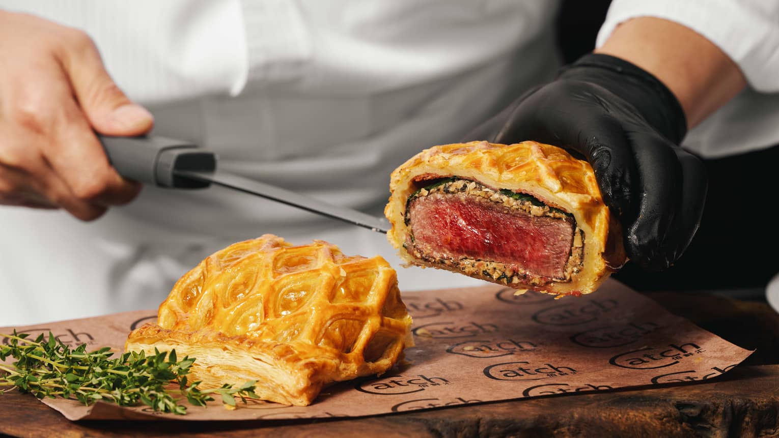 Seven-DAY DRY-AGED M9 BEEF TENDERLOIN WELLINGTONIberico Ham, Wild Mushrooms, Onion Purée, Beef Jus