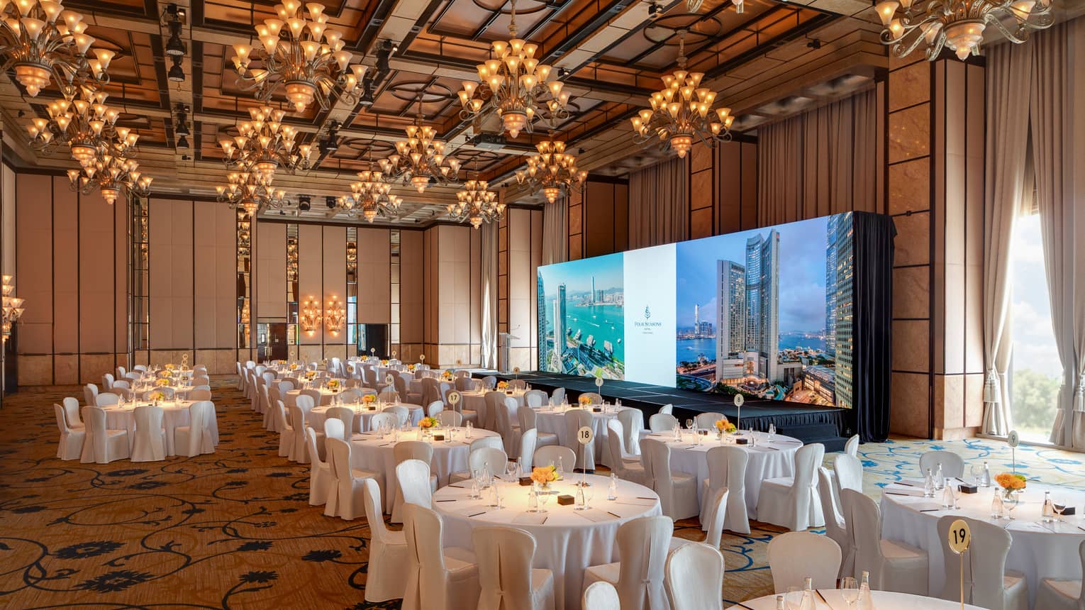 With wall-to-wall windows and majestic marble columns rising two-stories high, our pillarless Four Seasons Grand Ballroom offers a sophisticated setting for receptions, conferences and special occasions.