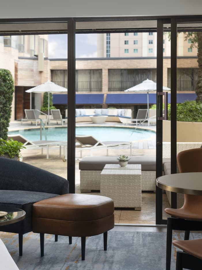 Exit through your sliding glass doors to a welcoming semi-private patio, and overlook the lush outdoor pool and deck.