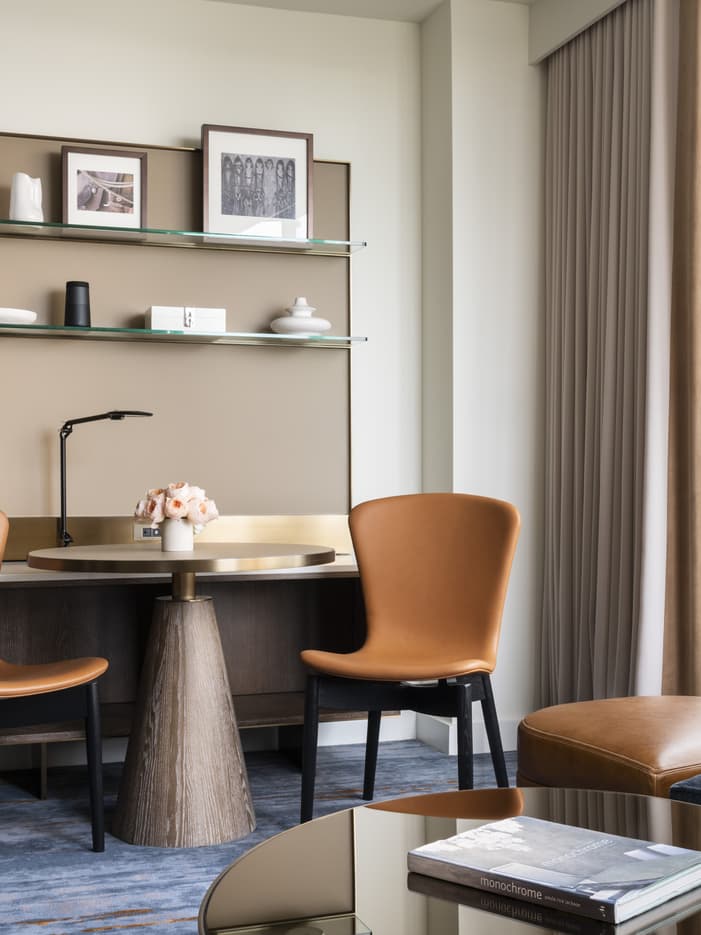 Texas roots are reflected in this room's natural oak pieces, colours – mimicking our city's bright blue skies and blood orange sunsets – as well as the book shelves lined with local art pieces, providing an elegant and comfortable backdrop.