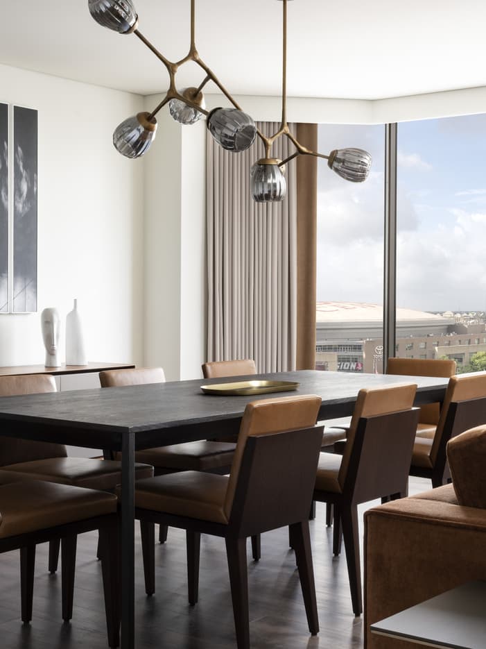 Gather for a nightcap with friends or host a meeting in this contemporary suite's expansive living room and dining room, while soaking in panoramic views of downtown Houston.