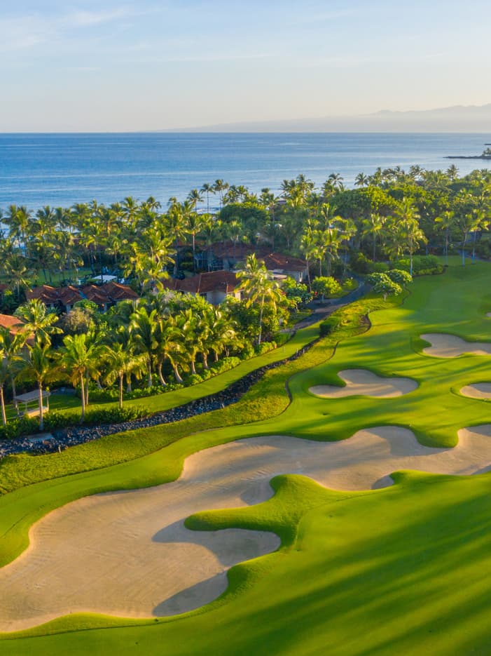 Hualalai Golf CourseCrafted with sensitivity to its unique environment, our 18-hole Jack Nicklaus–signature championship course winds over 7,100 yards, beginning in a lush oasis that flows across bright-green fairways contoured against black lava, then returns to the ocean for the final holes.