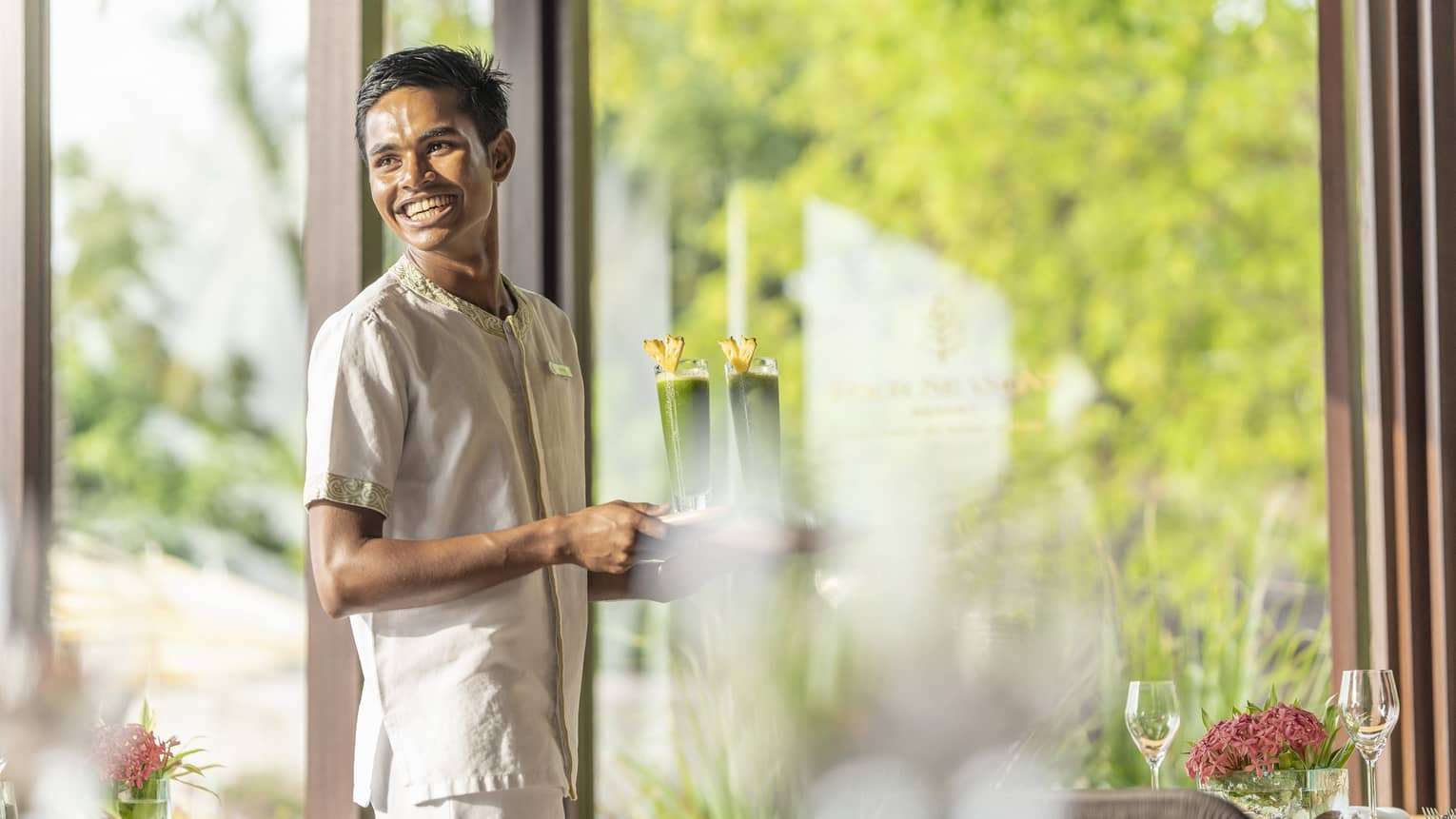 La ristorazione in bungalow Four Seasons è un'esperienza gastronomica eccellente, da concedersi nel comfort del proprio bungalow, della propria villa o suite. A qualsiasi ora del giorno potete scegliere da un menu variegato con ricette occidentali e asiatiche. La ristorazione in bungalow è disponibile 24 ore su 24.
