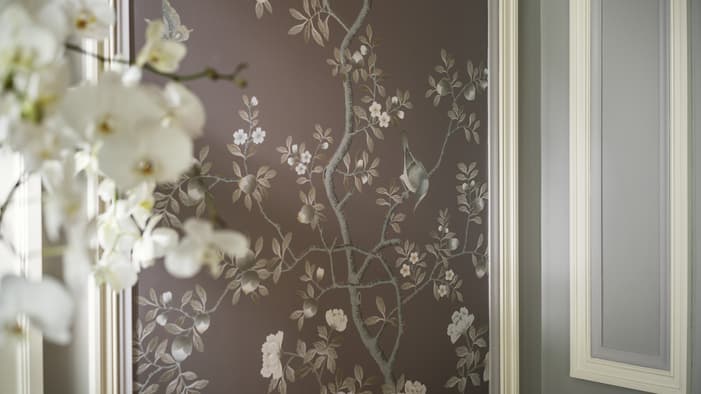 The delicate chinoiserie wallpaper decorating the wall panels comes in a palette of muted lilacs, cream and grey, helping to create a calming, subtle yet uplifting ambiance.