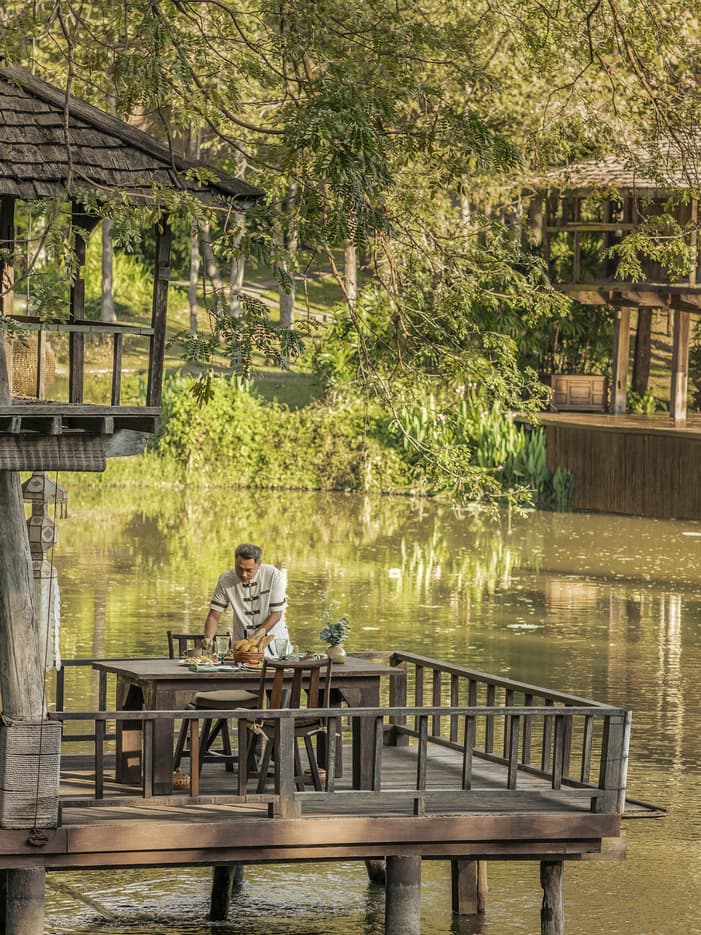 湖のほとりに佇む、タイの伝統的な納屋をイメージした素朴な雰囲気のダイニング施設です。一面に広がる緑の水田を眺めながら、プライベートブレックファストやディナーをお楽しみいただけます。