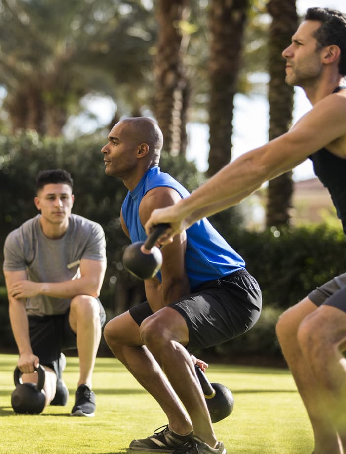 アウトドアフィットネス自然の中で気持ちよく体を動かすトレーニング。各ステーションをまわり、ケトルベル、縄跳び、ムエタイ、TRX(トータルボディ・レジスタンス・トレーニング)などのさまざまなエクササイズメニューをこなしながら、筋力、カーディオ、スピード、柔軟性、持久力の5つの要素をバランスよく鍛えることができます。