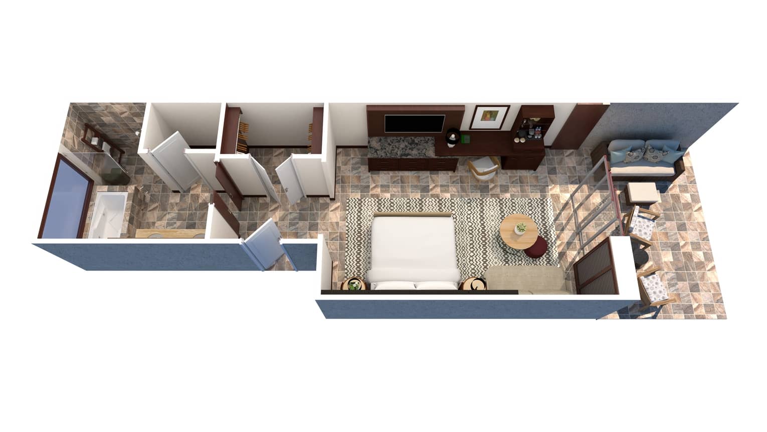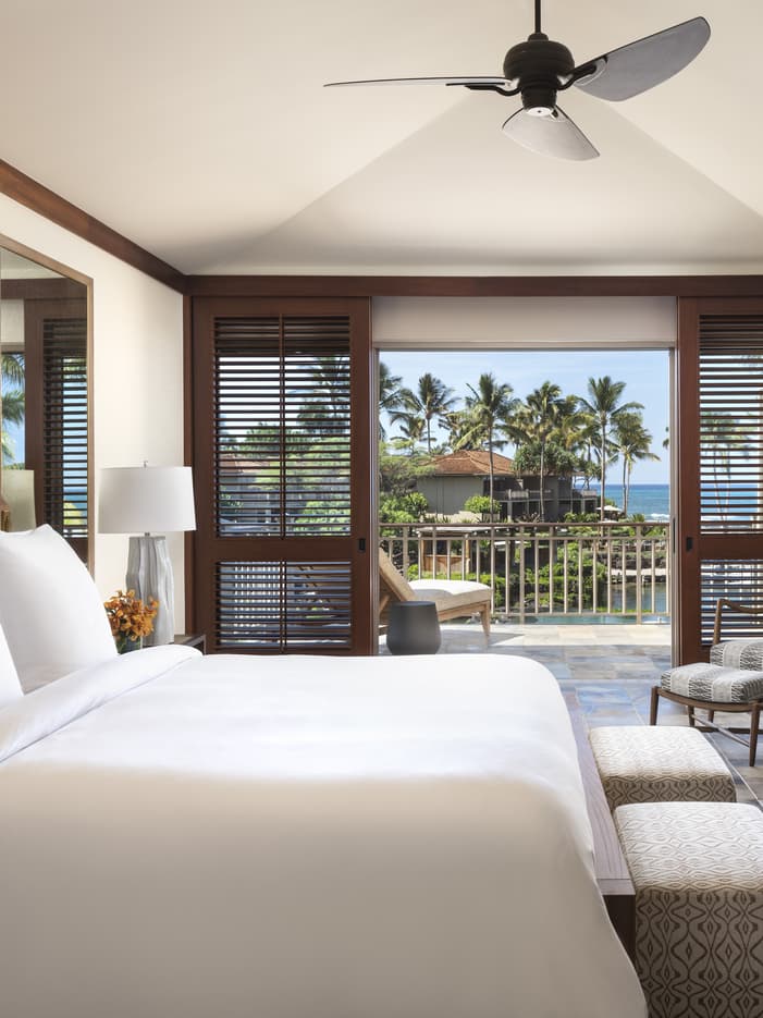 窓から一面の大海原を望むオーシャンビュールームです。広々としたリビングスペースが備わり、2階にはプライベートバルコニー、1階には溶岩を使用した屋外シャワーが付いています。