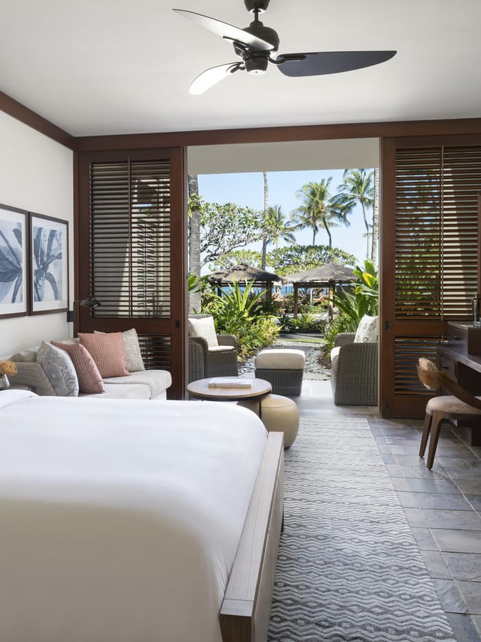 緑豊かな景色を見渡すプライベートラナイが備わるお部屋です。ラナイに続くプールでひと泳ぎしたり、ゆったりと美しい景色をお楽しみください。