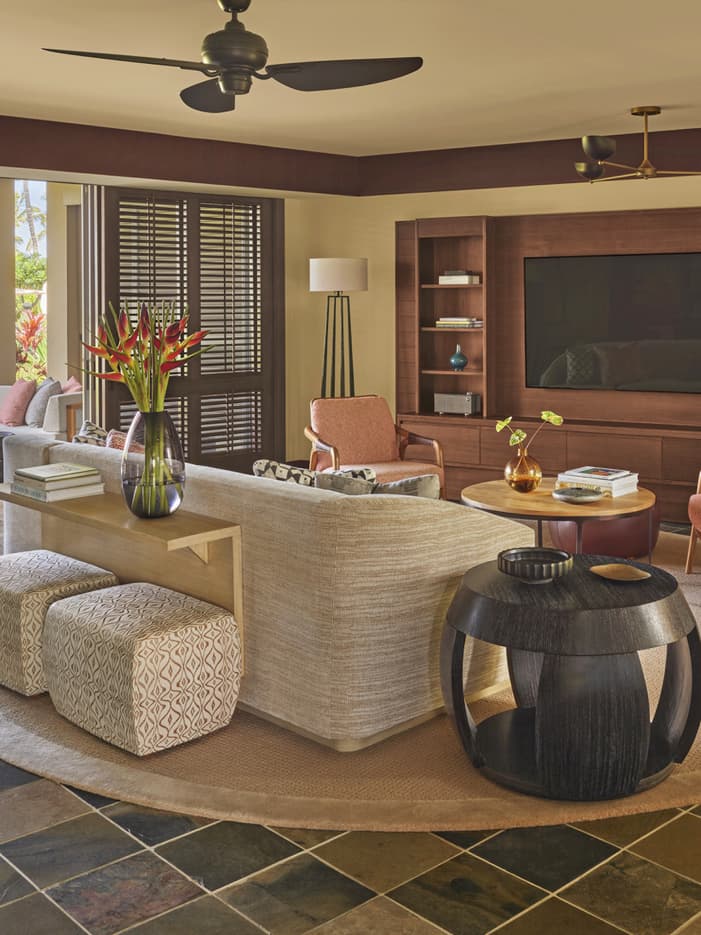 ハワイらしい温かみのある内装のお部屋です。ワイオルにはハワイ語で「心地よい水」という意味があり、パームグローブの池と庭園越しに広がる太平洋の美しい景色をお楽しみいただけます。