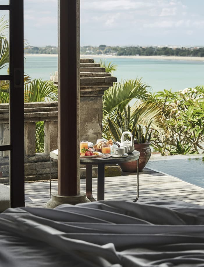 美味しそうな朝食の香りに包まれ目覚める、心地よい朝。プランジプールにフローティングトレイを浮かべれば、さらに優雅なバカンス気分を味わっていただけます。鳥たちのさえずりと海の絶景に浸りながら、贅沢な3コースブレックファストをお楽しください。