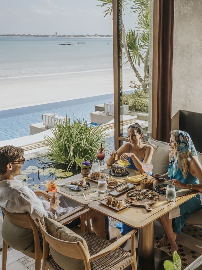 夜のダイニングメニューに、ジンバランの伝統的なバーベキュー文化からインスピレーションを得たシーフードディナーをご用意。すべての料理とデザートが森や煙、炎をイメージして盛り付けられ、力強くフレッシュな味です。燃えるような夕日を眺めながら味わえば、おいしさもひとしおに。日中は、バリ島最長クラスのビーチフロントのプールサイドで、ライトメニューのビーチクラブセレクションやサンデーブランチをゆっくりとお召し上がりください。