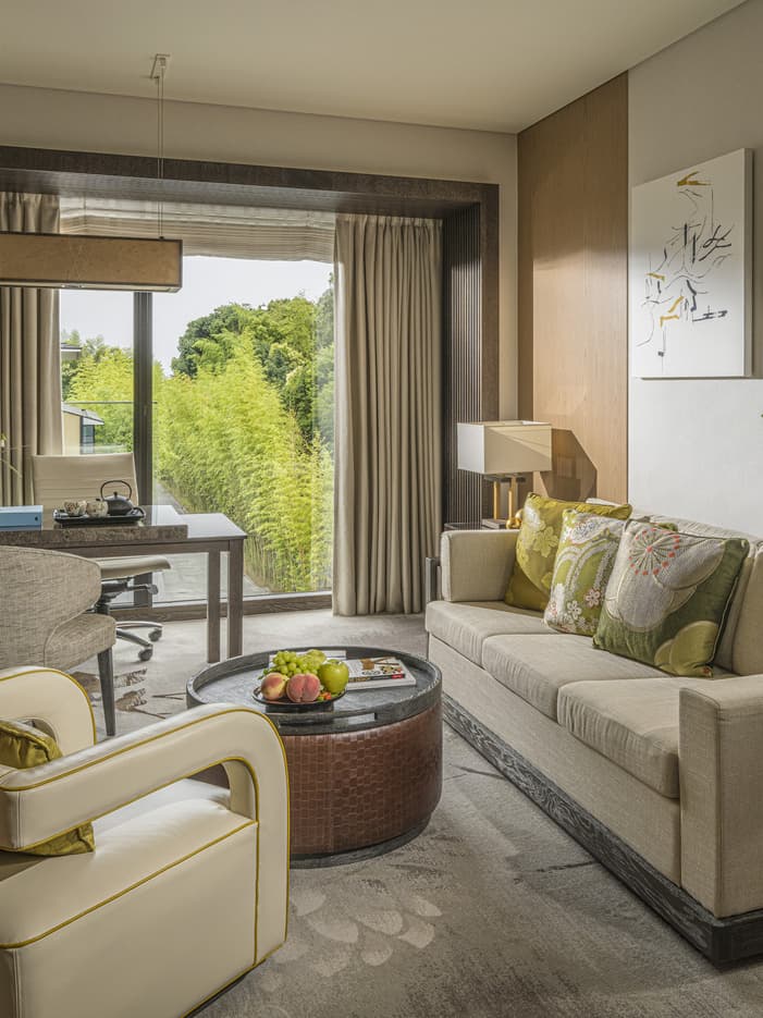 伝統とモダンが融合したデザインの1ベッドルームスイートには、ダイニングルーム、大理石のワーキングデスクが備わったリビングエリア、そしてベッドルームがありますプライバシーが保たれたベッドルームで、リラックスしたひとときをお過ごしください。