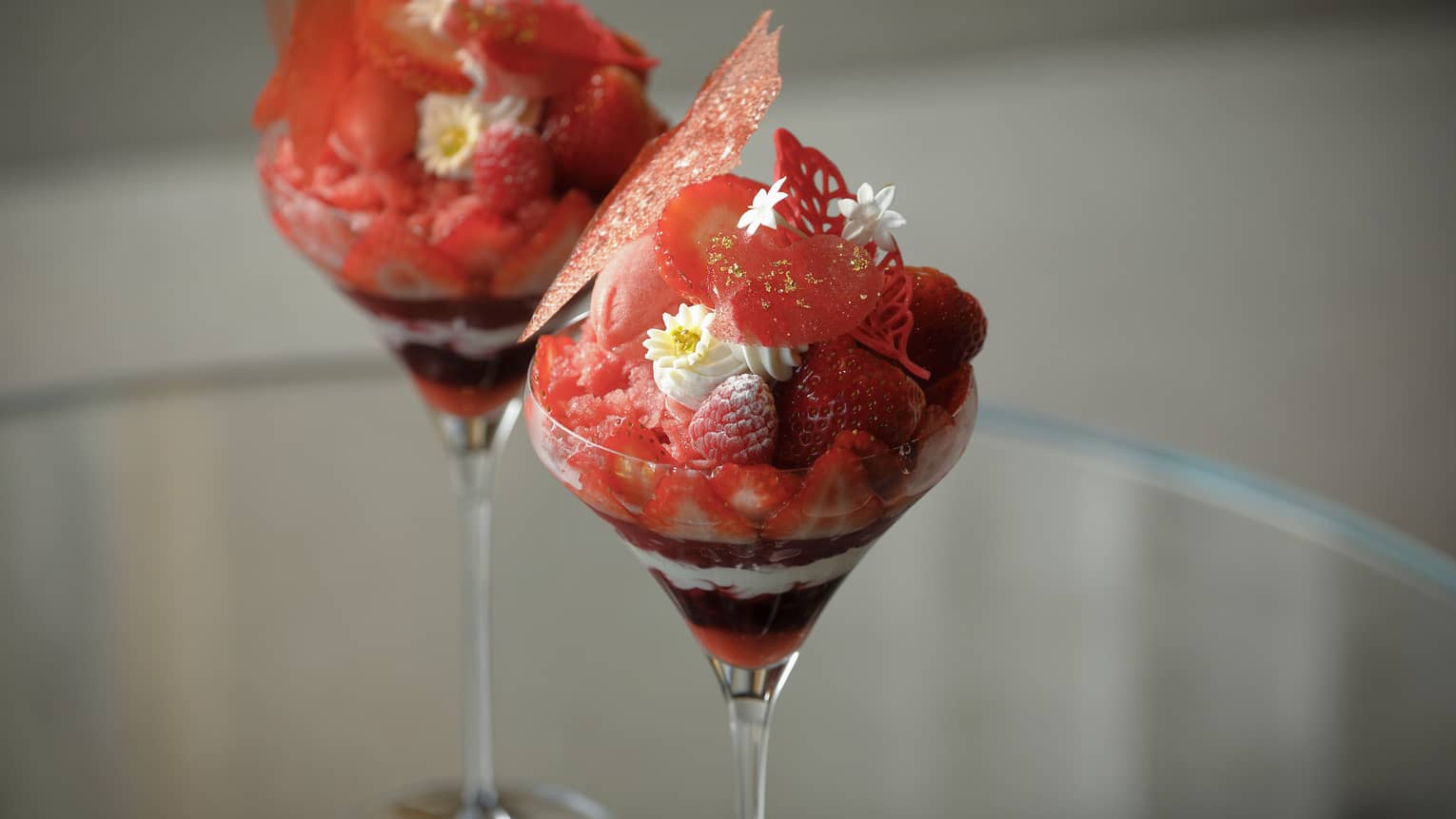 あまおうや旬のいちごを贅沢に使った1日20個限定のストロ ベリーパフェ。じっくりと煮込んだベリーのコンポート、甘く芳 醇な香りが特徴のトンカクリームに、ライチゼリーを重ねて、 冬ならではのハーモニーを奏でます。ほのかな苦みが全体を 引き締めるウーロン茶のエスプーマ、アーモンドクランブルを 食感のアクセントに、優雅なティータイムを演出するパフェに 仕立てました。||期間:2026年2月28日(土)まで||時間:12:00~15:00||料金:3,500円 ※要事前予約
