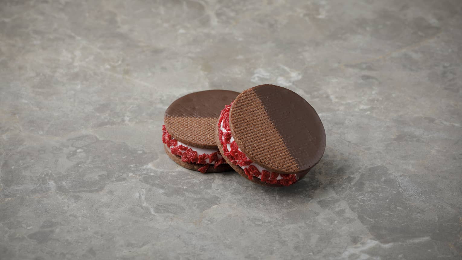 サクサクのココアクッキーでストロベリーとフランボワーズのマシュマロを挟んだクッキーサンド。ココアのほろ苦さをアクセントに、マシュマロの軽やかな甘さと贅沢な余韻をご堪能いただけるひと品です。||期間:2025年12月26日(金)~2026年2月28日(土)||時間:13:00~19:00||料金:600円/個