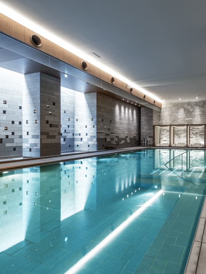 - プール (長さ20メートル、水深1メートル) ジャグジー2つ ラウンジデッキエリア 入浴施設(温浴、冷浴) サウナ(男性はミストサウナ、女性はドライサウナ) リラクゼーションラウンジ シャワールーム プライベートロッカー ファミリーロッカールーム(2部屋)