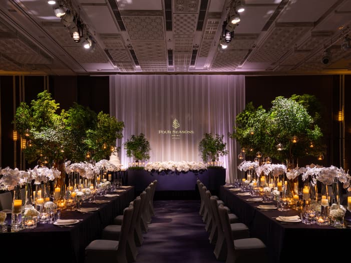伝統工芸の粋を凝らしたスタイリッシュな空間溢れるばかりの自然光に祝福されるボールルームは、壁一面を四季の花々を表現した西陣織の特大タペストリーが埋め尽くし、天井には「吹寄せ」や「二重麻ノ葉」「業平菱」といった華やかでおめでたい文様の組子細工があしらわれ、おふたりの門出を祝福します。繊細さあふれる雅な空間が唯一無二のウェディングを実現します。