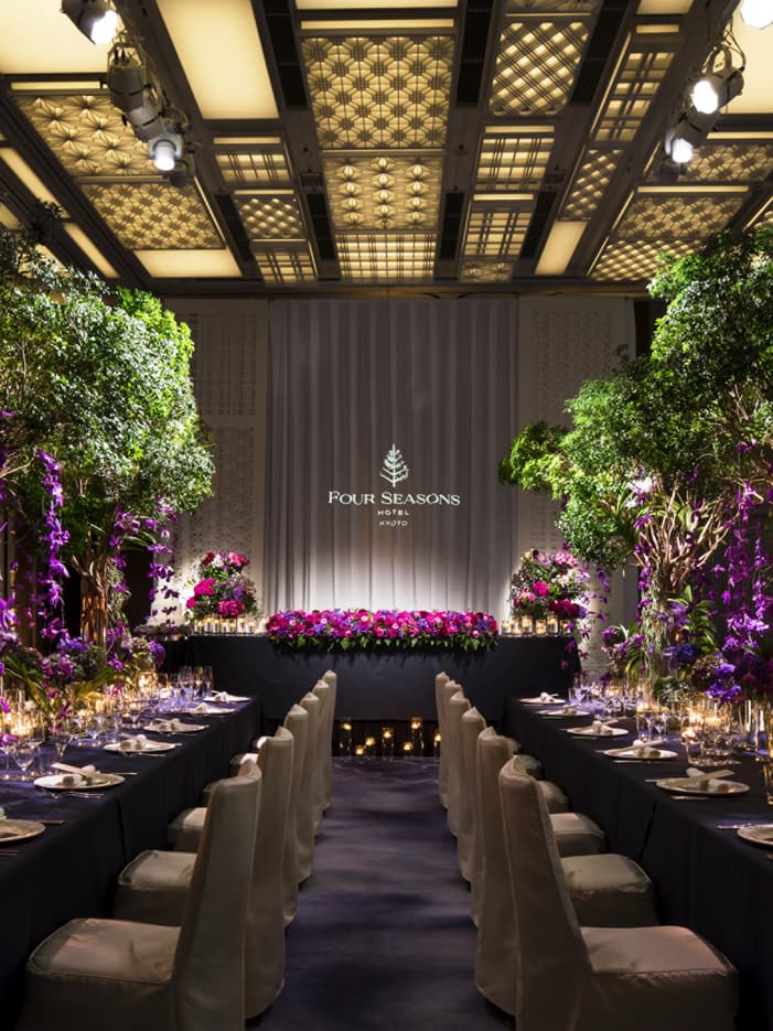 京都らしさとモダンな感性が融和したボールルームと宴会場。その現代的でスタイリッシュな空間が、今日からはじまるおふたりの物語を優しく祝福します。