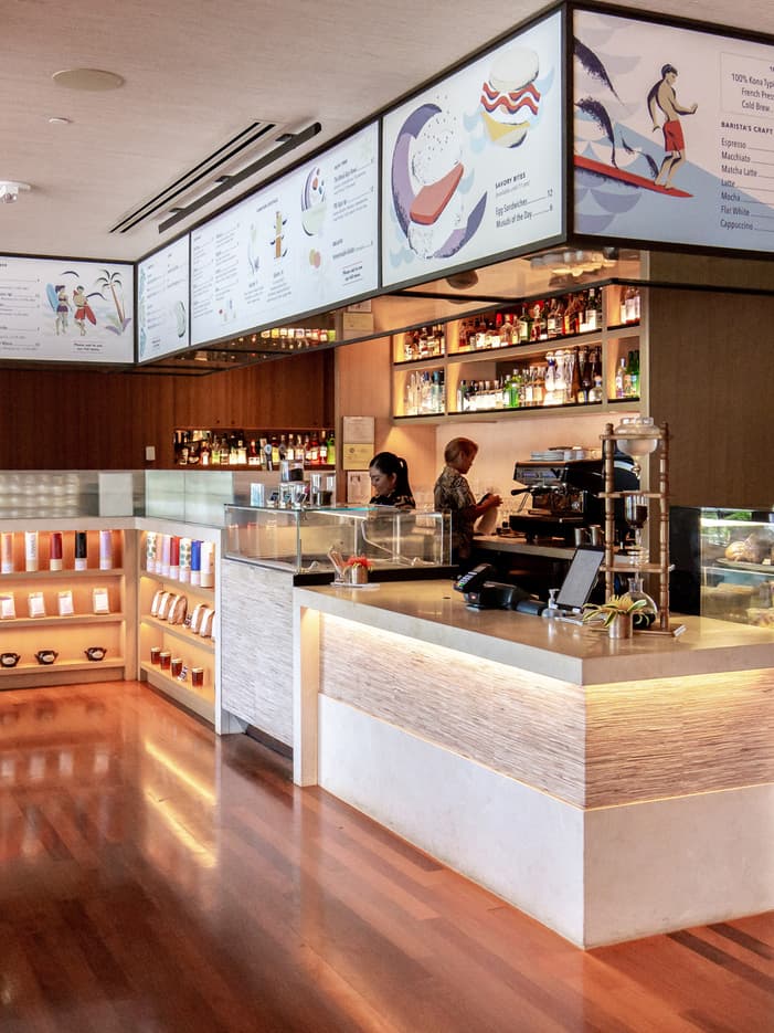屋外にあるカジュアルなバーで、朝食にはハワイ産のスペシャルコーヒーとペストリーなどの軽めのメニュ―、ランチにはサラダやサンドイッチ、自家製ジェラート、夜は地ビールやワイン、創作カクテルと一緒に軽食やデザートをお楽しみいただけます。ビリヤードなどのテーブルゲームに興じたり、大型テレビでスポーツ観戦を楽しんだり、美しい景色を眺めながらくつろいだりと思い思いのひとときをお過ごしください。