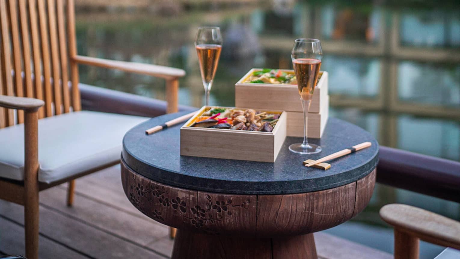 池庭「積翠園」の四季を水面に映す池のほとりにたたずむ「楓樹」は、伝統的な数寄屋造りの建築様式を取り入れた雅なラウンジです。日中には抹茶とオリジナルの和菓子などを、夕暮れどきになるとシャンパンと日本酒を洗練されたスタイルで味わえる風流なバーに変身します。