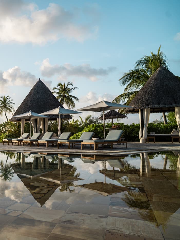 メインプール青い水平線に溶け込むかのようなインフィニティエッジ構造の淡水プールは、モルディブでも最大級の規模を誇ります。プールサイドの広いサンデッキには、ゆっくりとおくつろぎいただけるようサマーベッドを設置しています。