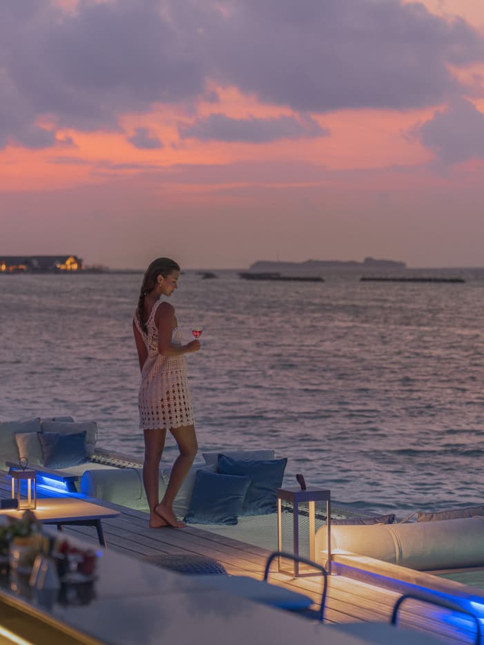 モルディブの中でも特にリラックスした贅沢な空間を提供する水上ラウンジ。デッキの下には紺碧のラグーンが広がり、レモンザメやリーフフィッシュがゆったりと泳いでいます。柔らかなクッションに身を委ね、ライブDJの音楽とともにフローズンマルガリータや、タパススタイルのお料理をお楽しみください。