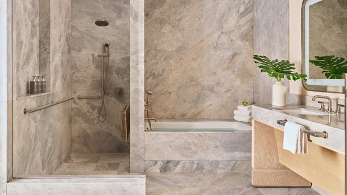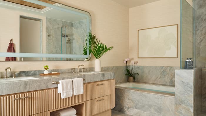 広々としたリビングエリアと独立したベッドルーム、バスルーム1つとパウダールーム、プライベートバルコニーが備わり、我が家のように快適にお過ごしいただけます。開放感のある落ち着いた空間に最新テクノロジー、高速Wi-Fi、ダイニングエリア、プライベートバーなどの各種設備をご用意。ご家族やご友人との和やかな時間をお楽しみください。
