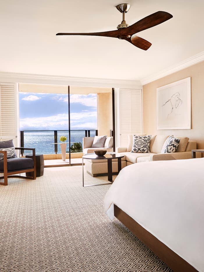 海の景色が一面に広がるリゾート最上階のお部屋です。天井が高くゆとりのある空間は、ハワイのアートコレクションが飾られた洗練されたインテリアが特徴です。多彩なクラブラウンジ特典、専属コンシェルジュサービスをご利用いただけます。