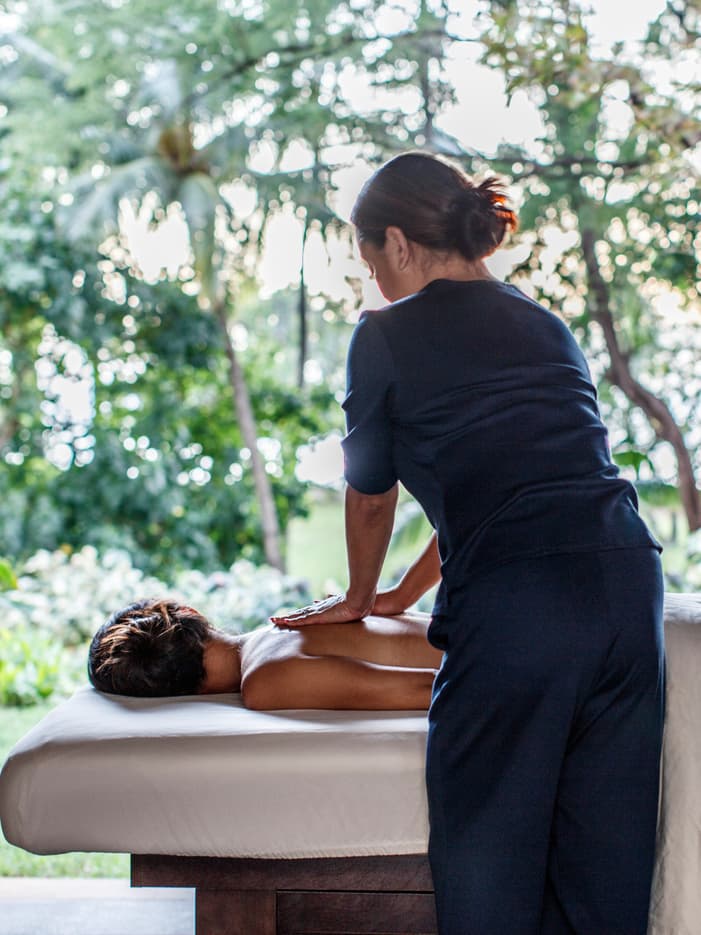 美しい景色に包まれた癒し空間 美しい景色に包まれた癒し空間- 緑豊かな庭園を望むスパは、心落ち着く安らぎの空間。屋外のプライベートハレ/カバナで贅沢なマッサージもご利用いただけます。