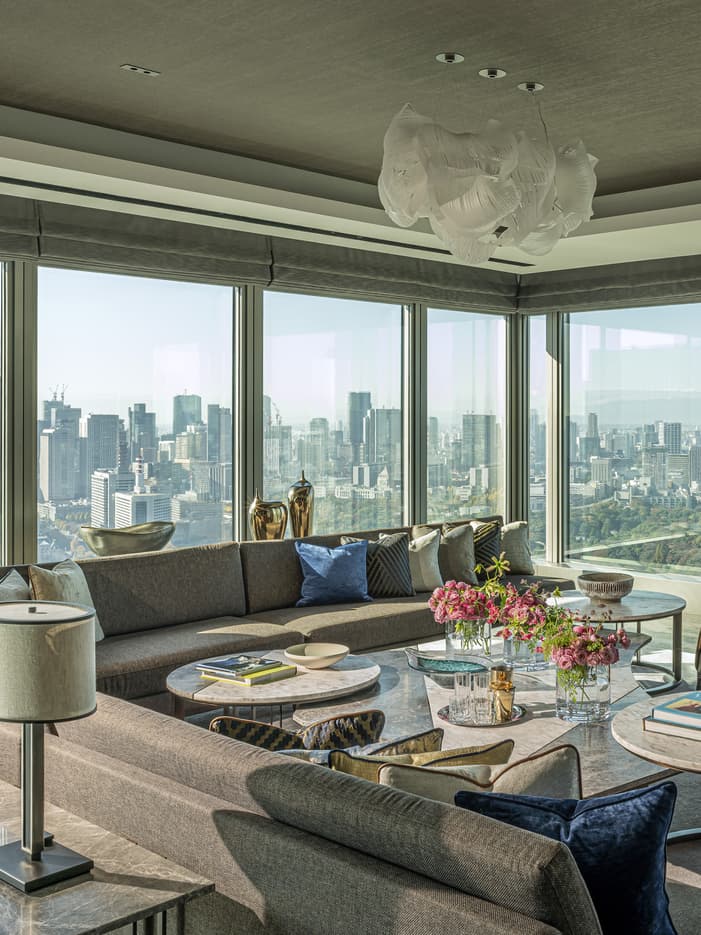 38階に位置し、皇居の杜と東京市街のパノラマビューを一望するラグジュアリースイート。日本的な洗練と華美が共存する空間で、昼は大きな窓から柔らかな日差しがたっぷりと差し込み、夜は煌びやかなシャンデリアの光に包まれます。ダイニングテーブル(8名用)、落ち着いた雰囲気の書斎などの豪華な設備も備わっています。このスイートは3ベッドルームスイートとしてもご利用いただけます。詳細はホテルまでお問い合わせください。