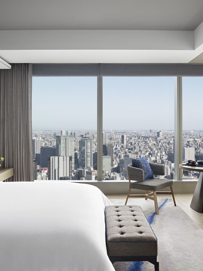 スタイリッシュで広々したコーナールーム 。窓から自然光が降り注ぎ、東京を象徴する眺望をお楽しみいただけます。ワーキングデスクとオットマンをご用意し、お仕事にもリラックスタイムにも最適なアーバンオアシスです。