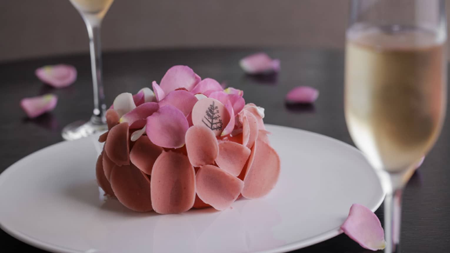 ミシュラン星付きダイニング「est」のミケーレ・アッバテマルコが手がける「ガトーブーケ」。艶やかな苺のグラサージュに、ルビーのように輝くフランボワーズと気品あふれるバラの花びらを添え、開けた瞬間から最後のひと口まで、花束のように輝きを放つ、特別な日にふさわしい贅沢でエレガントなブーケケーキです。||料金:13センチ5,800円
