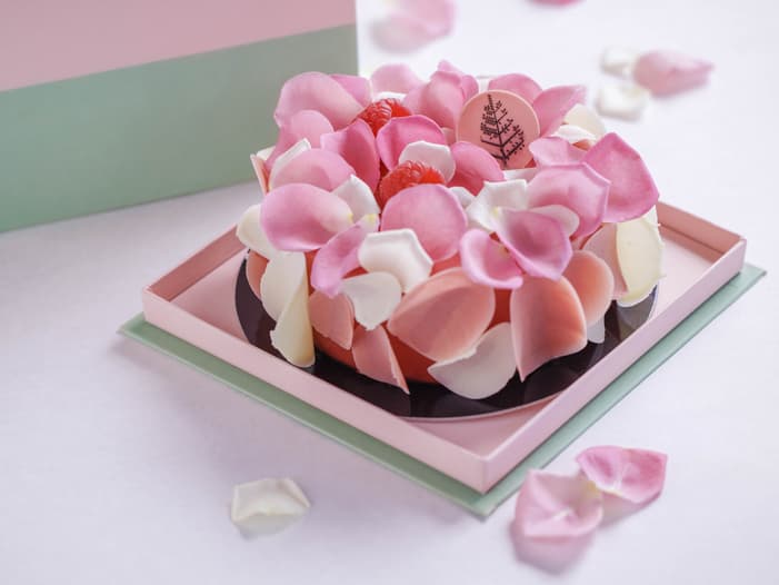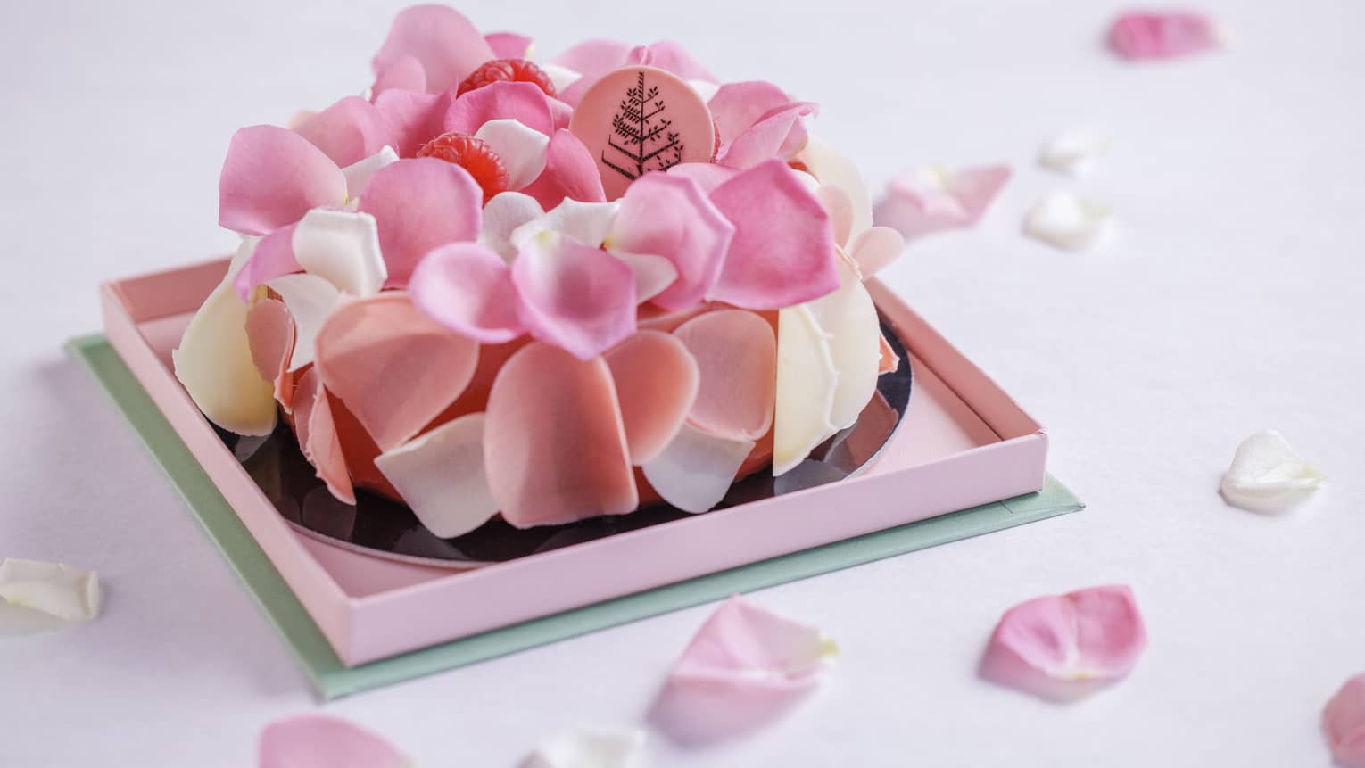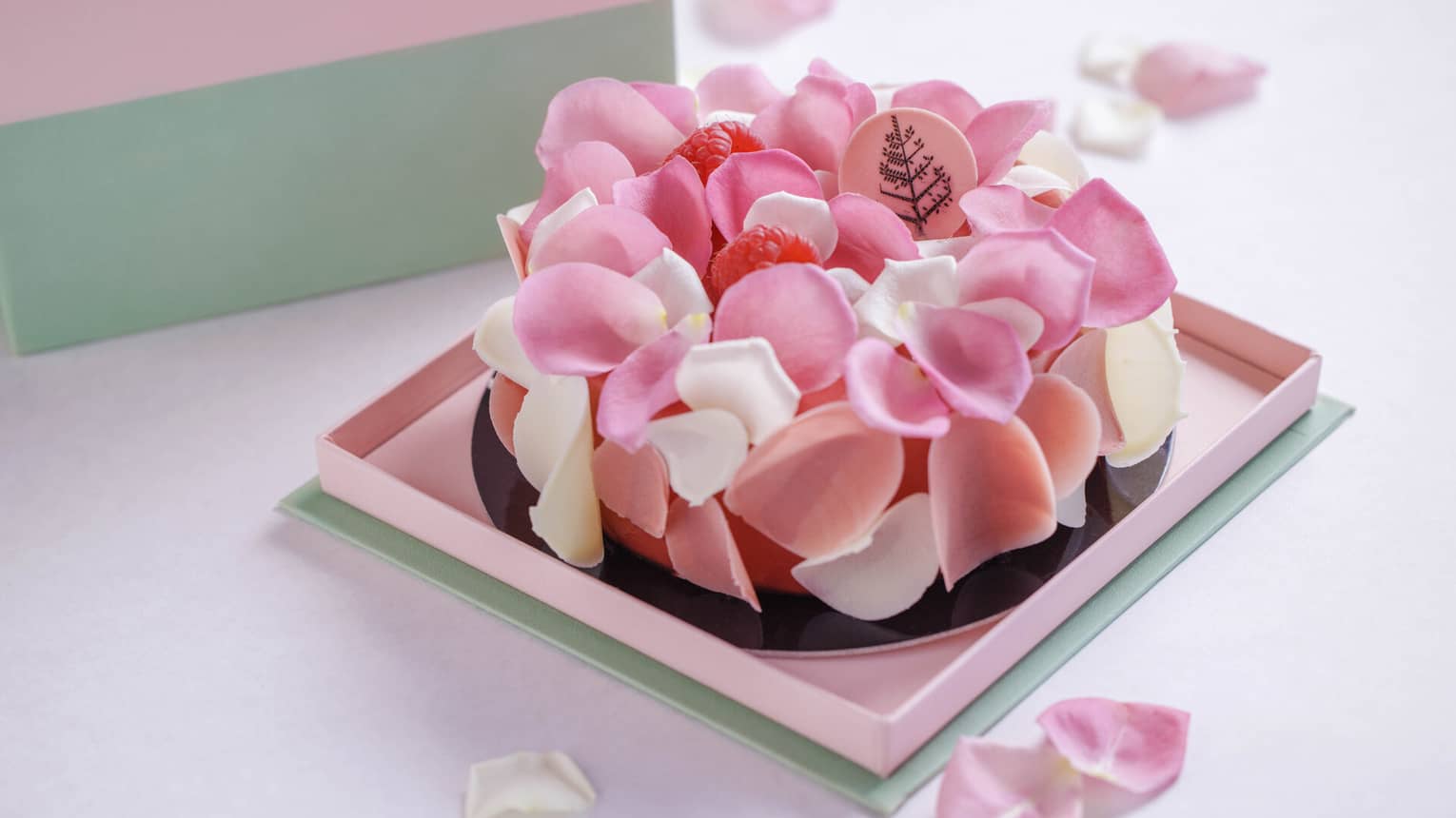 ミシュラン星付きダイニング「est」のミケーレ・アッバテマルコが手がける「ガトーブーケ」。艶やかな苺のグラサージュに、ルビーのように輝くフランボワーズと気品あふれるバラの花びらを添え、開けた瞬間から最後のひと口まで、花束のように輝きを放つ、特別な日にふさわしい贅沢でエレガントなブーケケーキです。||料金:13センチ6,500円