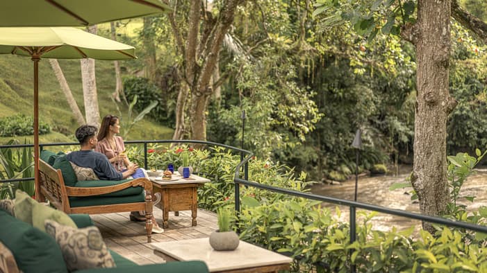 チーク材のデッキからアユン川渓谷を一望する開放感あふれるラウンジ。アフタヌーンティーや軽食など、優雅な午後のひとときをお楽しみください。
