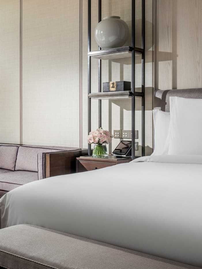 床から天井までの窓から自然光がたっぷりと注ぐ、静かでゆったりとした2名用のゲストルーム。市街の素晴らしい景色を望み、広々としたリビングエリア、エグゼクティブデスク、イタリア産大理石を使用した贅沢なバスルームが備わります。