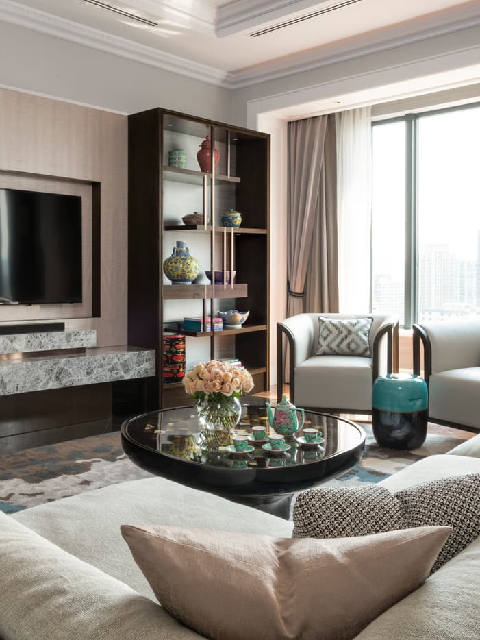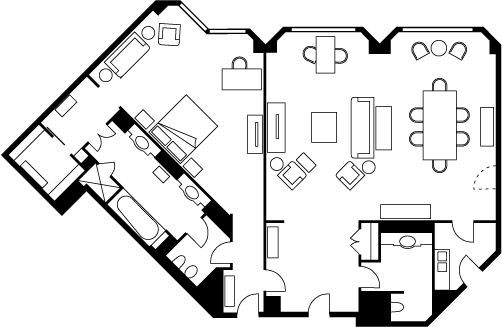 ご家族や仕事仲間とのお食事に便利なキチネット付きのスイート。革張りのエルゴノミクスチェア、デスクランプ、大きなエグゼクティブデスクも用意され、お部屋でのお仕事にも最適です。このスイートをご予約いただくと、大人 2 名様までエグゼクティブ クラブをご利用いただけます。