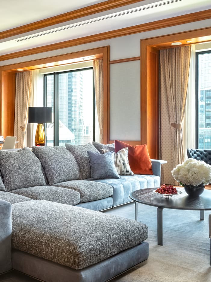 19階にあるシティビューを望むスイート。ゲストとダイニングテーブルを囲み、景色を眺めながら会話を楽しむことができます。「おやすみ」の挨拶をした後は、たっぷりお湯を張ったバスタブに身を委ね、一日の疲れを癒すバスタイムに。このスイートをご予約いただくと、大人 2 名様までエグゼクティブ クラブをご利用いただけます。