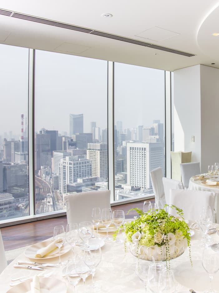 都内を一望、スカイチャペル31階のエグゼクティブダイニングルームがチャペルに。皇居、東京タワー、レインボーブリッジといった都心のランドマークを望む絶景のチャペル。東京がお二人の未来を祝福します。